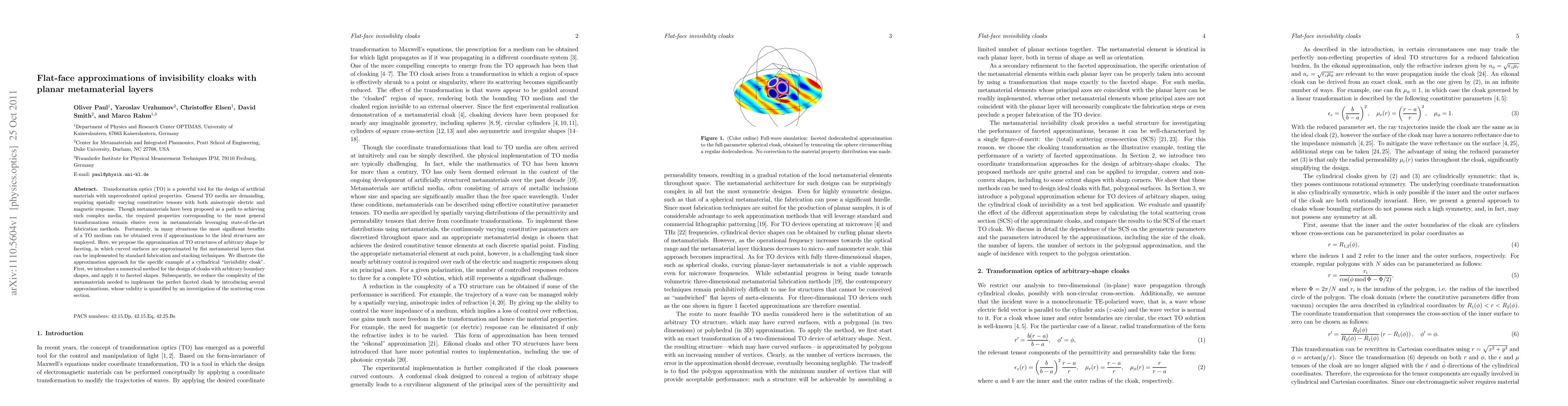 Transformation optics (TO) is a powerful tool for the design of artiffcial materials with unprecedented optical properties. Here, we propose the approximation of TO structures of arbitrary shape by faceting, in which curved surfaces are approximated by at metamaterial layers that can be implemented by standard fabrication and stacking techniques. We illustrate the approximation approach for the specific example of a cylindrical invisibility cloak. First, we introduce a numerical method for the design of cloaks with arbitrary boundary shapes, and apply it to faceted shapes. Subsequently, we reduce the complexity of the metamaterials needed to implement the perfect faceted cloak by introducing several approximations, whose validity is quantified by an investigation of the scattering cross section.