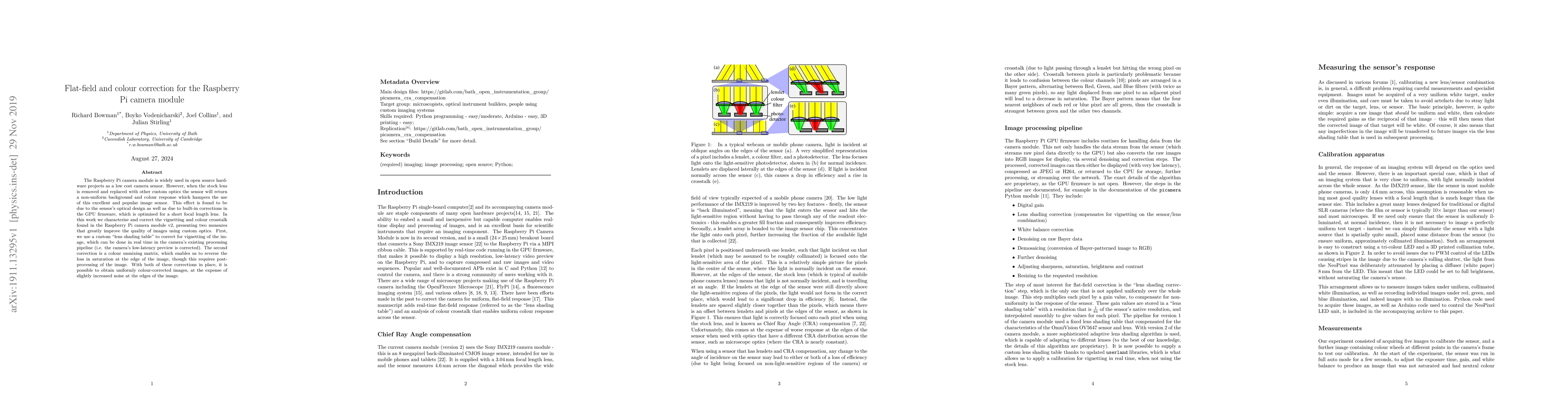 This paper addresses the non-uniform background and color response issues in the Raspberry Pi camera module v2 when custom optics are used. It proposes real-time vignetting correction via a lens shading table and post-processing color unmixing to reverse saturation loss, significantly improving image quality.
