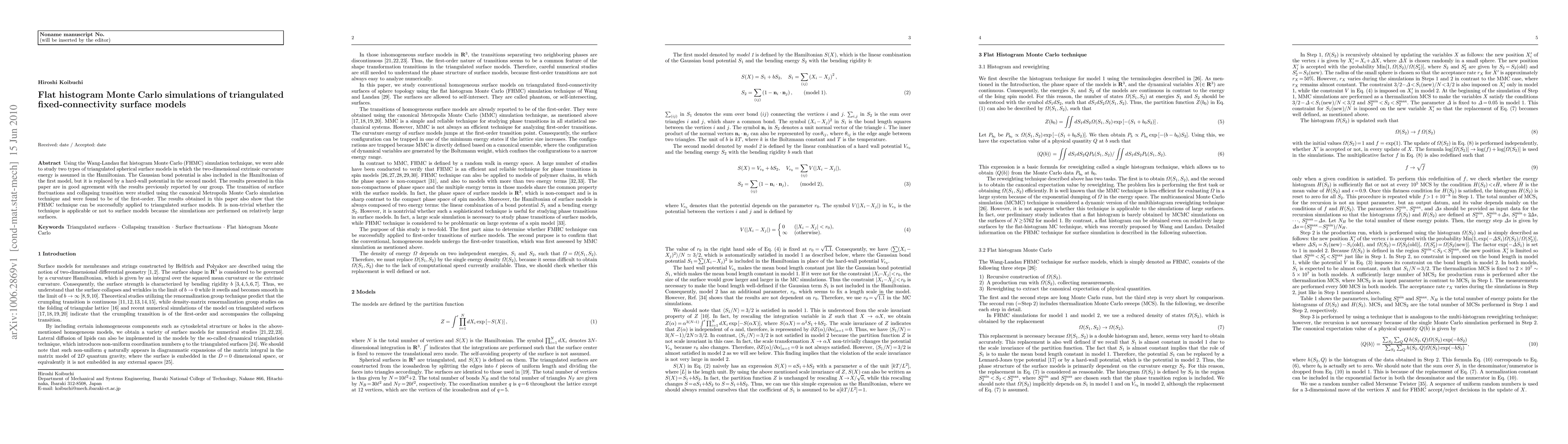 Using the Wang-Landau flat histogram Monte Carlo (FHMC) simulation technique, we were able to study two types of triangulated spherical surface models in which the two-dimensional extrinsic curvature energy is assumed in the Hamiltonian. The Gaussian bond potential is also included in the Hamiltonian of the first model, but it is replaced by a hard-wall potential in the second model. The results presented in this paper are in good agreement with the results previously reported by our group. The transition of surface fluctuations and collapsing transition were studied using the canonical Metropolis Monte Carlo simulation technique and were found to be of the first-order. The results obtained in this paper also show that the FHMC technique can be successfully applied to triangulated surface models. It is non-trivial whether the technique is applicable or not to surface models because the simulations are performed on relatively large surfaces.