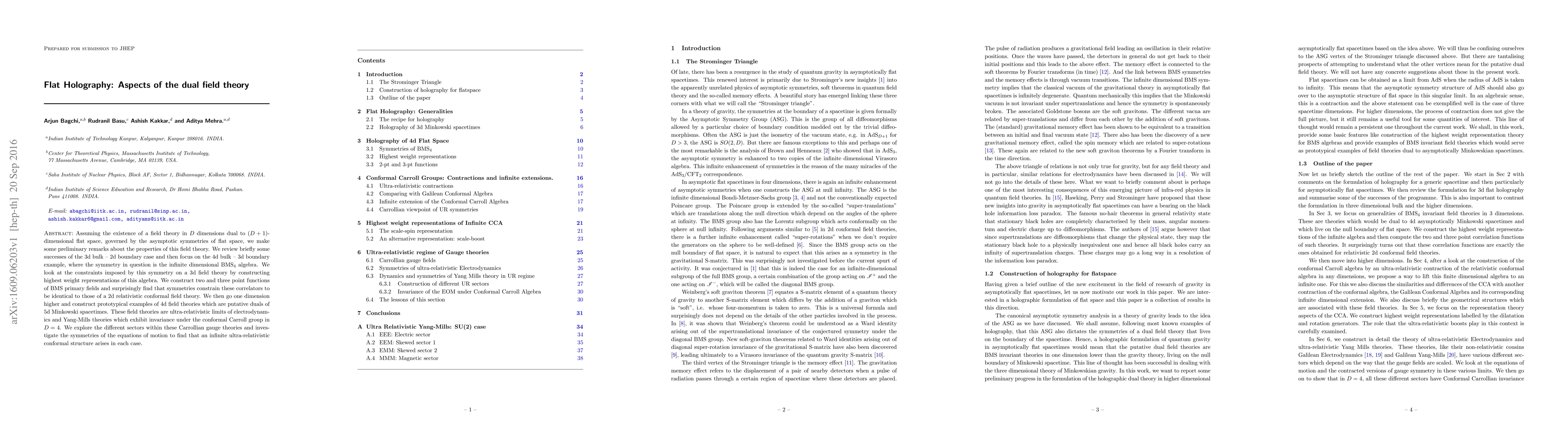 Assuming the existence of a field theory in D dimensions dual to (D+1)-dimensional flat space, governed by the asymptotic symmetries of flat space, we make some preliminary remarks about the properties of this field theory. We review briefly some successes of the 3d bulk - 2d boundary case and then focus on the 4d bulk - 3d boundary example, where the symmetry in question is the infinite dimensional BMS4 algebra. We look at the constraints imposed by this symmetry on a 3d field theory by constructing highest weight representations of this algebra. We construct two and three point functions of BMS primary fields and surprisingly find that symmetries constrain these correlators to be identical to those of a 2d relativistic conformal field theory. We then go one dimension higher and construct prototypical examples of 4d field theories which are putative duals of 5d Minkowski spacetimes. These field theories are ultra-relativistic limits of electrodynamics and Yang-Mills theories which exhibit invariance under the conformal Carroll group in D=4. We explore the different sectors within these Carrollian gauge theories and investigate the symmetries of the equations of motion to find that an infinite ultra-relativistic conformal structure arises in each case.
