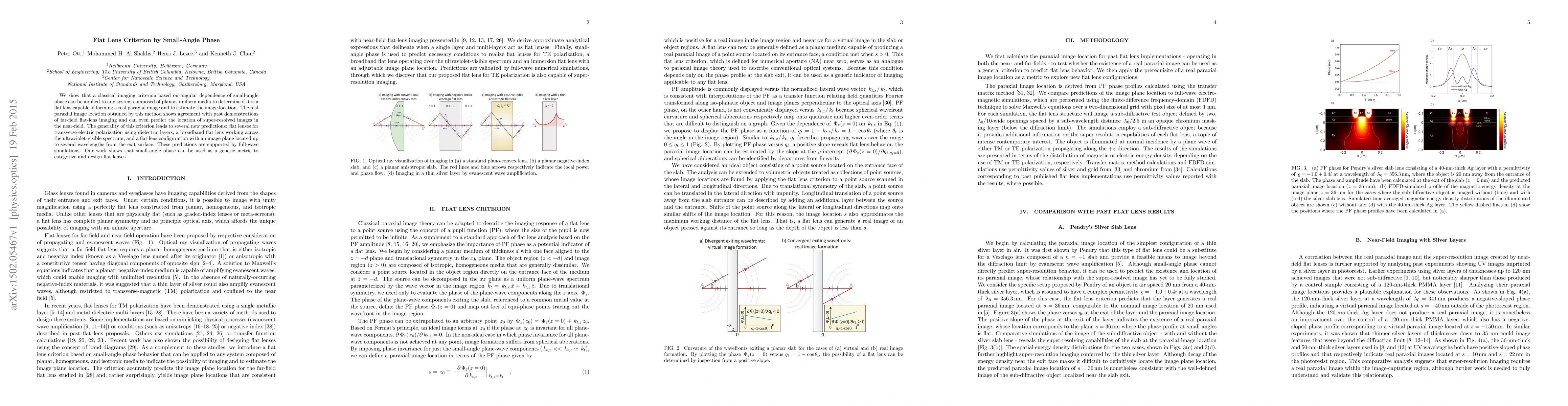 We show that a classical imaging criterion based on angular dependence of small-angle phase can be applied to any system composed of planar, uniform media to determine if it is a flat lens capable of forming a real paraxial image and to estimate the image location. The real paraxial image location obtained by this method shows agreement with past demonstrations of far-field flat-lens imaging and can even predict the location of super-resolved images in the near-field. The generality of this criterion leads to several new predictions: flat lenses for transverse-electric polarization using dielectric layers, a broadband flat lens working across the ultraviolet-visible spectrum, and a flat lens configuration with an image plane located up to several wavelengths from the exit surface. These predictions are supported by full-wave simulations. Our work shows that small-angle phase can be used as a generic metric to categorize and design flat lenses.