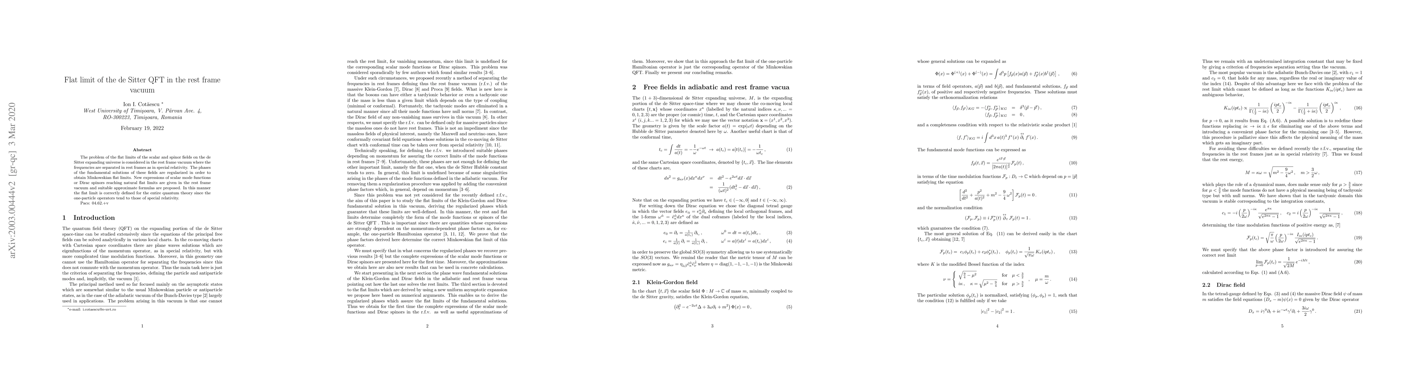 The problem of the flat limits of the scalar and spinor fields on the de Sitter expanding universe is considered in the rest frame vacuum where the frequencies are separated in rest frames as in special relativity. The phases of the fundamental solutions of these fields are regularized in order to obtain Minkowskian flat limits. New expressions of scalar mode functions or Dirac spinors reaching natural flat limits are given in the rest frame vacuum and suitable approximate formulas are proposed. In this manner the flat limit is correctly defined for the entire quantum theory since the one-particle operators tend to those of special relativity.