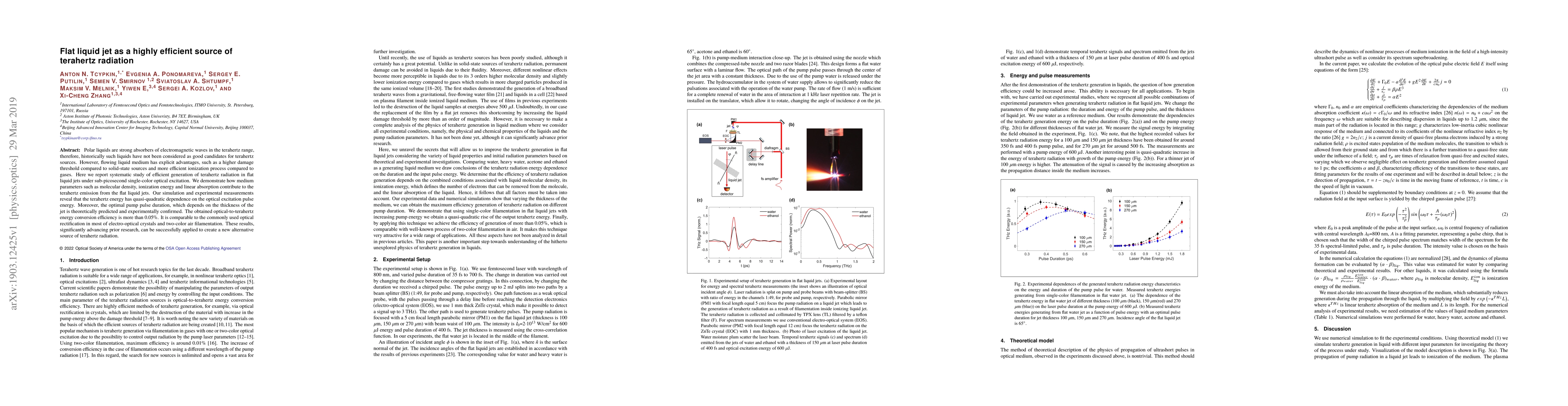 This paper investigates the generation of terahertz radiation from flat liquid jets under sub-picosecond optical excitation, demonstrating high efficiency and a quasi-quadratic dependence on excitation pulse energy. The study reveals that liquid jets offer advantages over solid-state sources and gases, achieving an optical-to-terahertz conversion efficiency comparable to traditional methods.