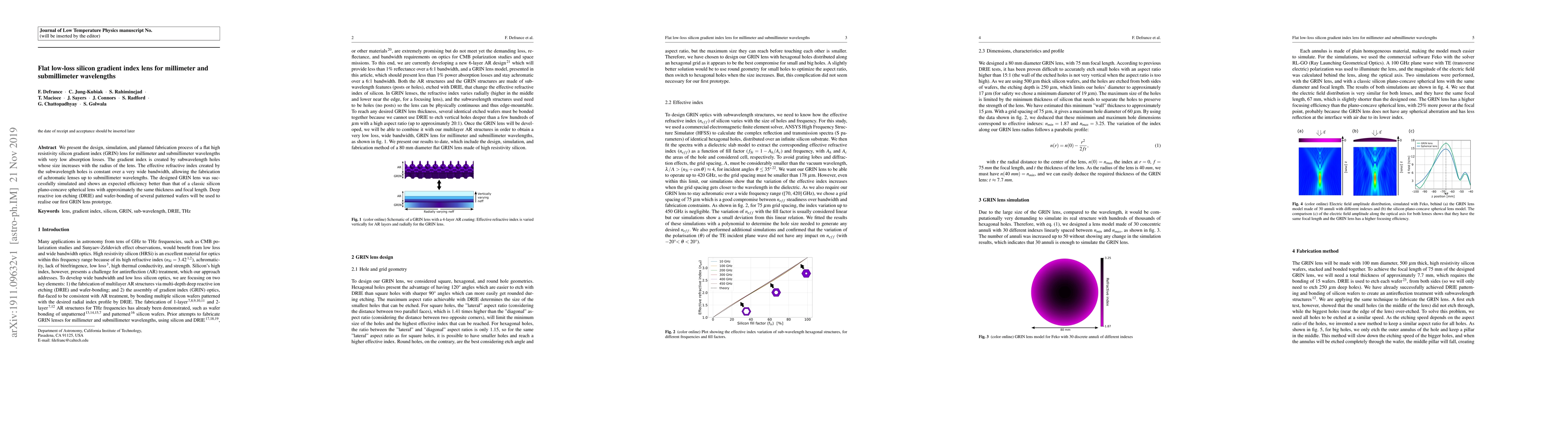 This paper details the design and simulation of a flat, low-loss silicon gradient index lens for millimeter and submillimeter wavelengths, featuring subwavelength holes to create a constant refractive index over a wide bandwidth. The lens prototype is planned to be fabricated using deep reactive ion etching and wafer-bonding techniques.