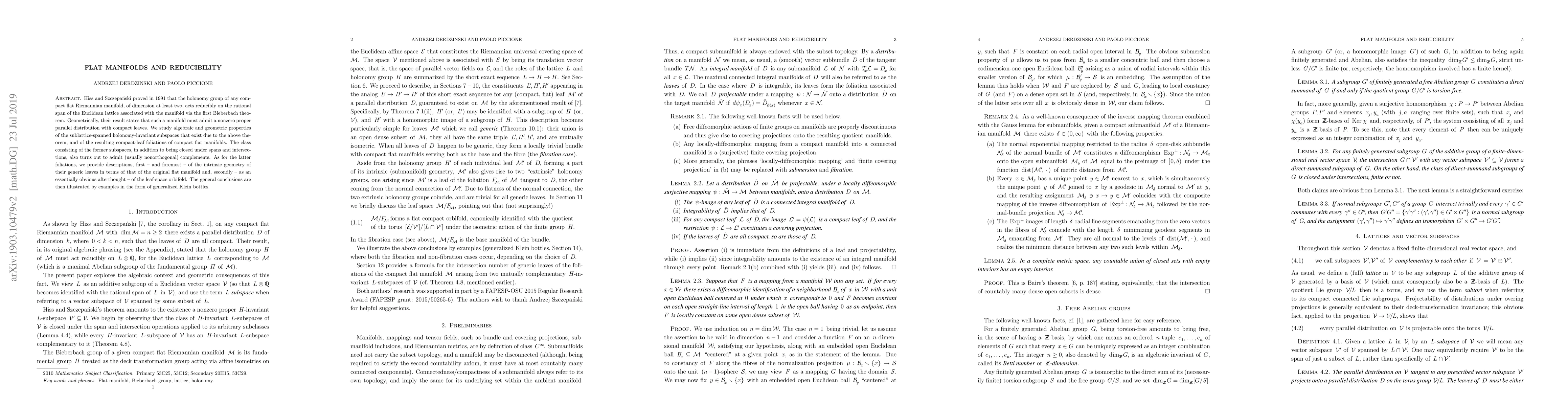 Hiss and Szczepa\'nski proved in 1991 that the holonomy group of any compact flat Riemannian manifold, of dimension at least two, acts reducibly on the rational span of the Euclidean lattice associated with the manifold via the first Bieberbach theorem. Geometrically, their result states that such a manifold must admit a nonzero proper parallel distribution with compact leaves. We study algebraic and geometric properties of the sublattice-spanned holonomy-invariant subspaces that exist due to the above theorem, and of the resulting compact-leaf foliations of compact flat manifolds. The class consisting of the former subspaces, in addition to being closed under spans and intersections, also turns out to admit (usually nonorthogonal) complements. As for the latter foliations, we provide descriptions, first -- and foremost -- of the intrinsic geometry of their generic leaves in terms of that of the original flat manifold and, secondly -- as an essentially obvious afterthought -- of the leaf-space orbifold. The general conclusions are then illustrated by examples in the form of generalized Klein bottles.