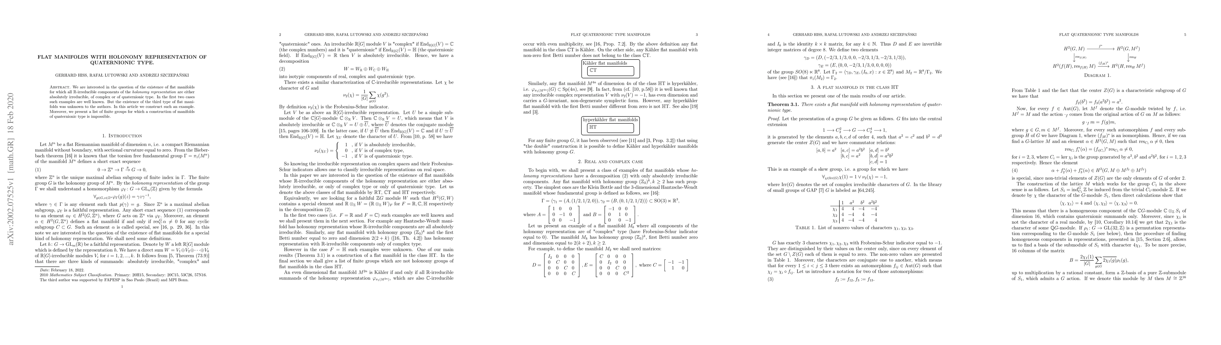 We are interested in the question of the existence of flat manifolds for which all $\mathbb R$-irreducible components of the holonomy representation are either absolutely irreducible, of complex or of quaternionic type. In the first two cases such examples are well known. But the existence of the third type of flat manifolds was unknown to the authors. In this article we construct such an example. Moreover, we present a list of finite groups for which a construction of manifolds of quaternionic type is impossible.