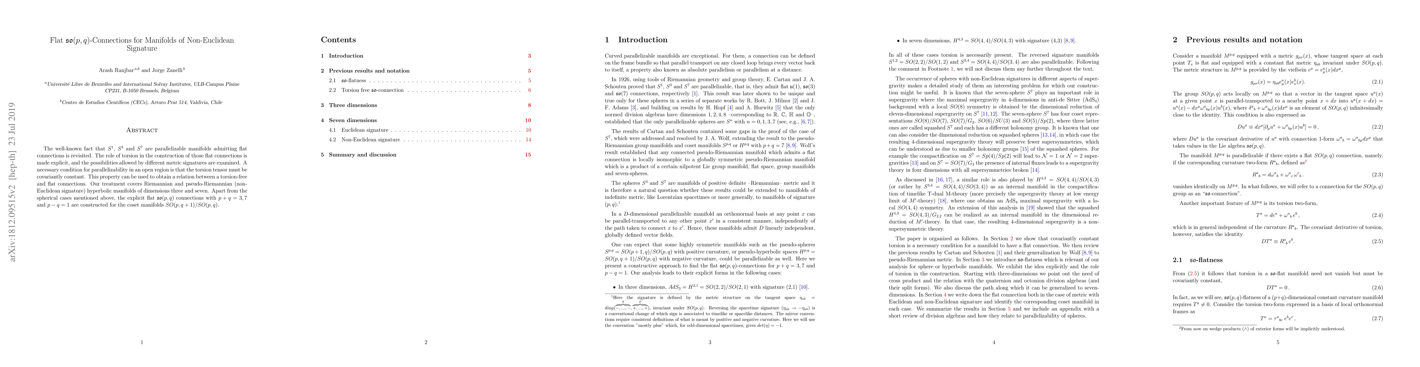 The well-known fact that $S^1$, $S^3$ and $S^7$ are parallelizable manifolds admitting flat connections is revisited. The role of torsion in the construction of those flat connections is made explicit, and the possibilities allowed by different metric signatures are examined. A necessary condition for parallelizability in an open region is that the torsion tensor must be covariantly constant. This property can be used to obtain a relation between a torsion-free and flat connections. Our treatment covers Riemannian and pseudo-Riemannian (non-Euclidean signature) hyperbolic manifolds of dimensions three and seven. Apart from the spherical cases mentioned above, the explicit flat $\mathfrak{so}(p,q)$ connections with $p+q=3,7$ are constructed for the coset manifolds $SO(p,q+1)/SO(p,q)$ or $SO(p+1,q)/SO(p,q)$.