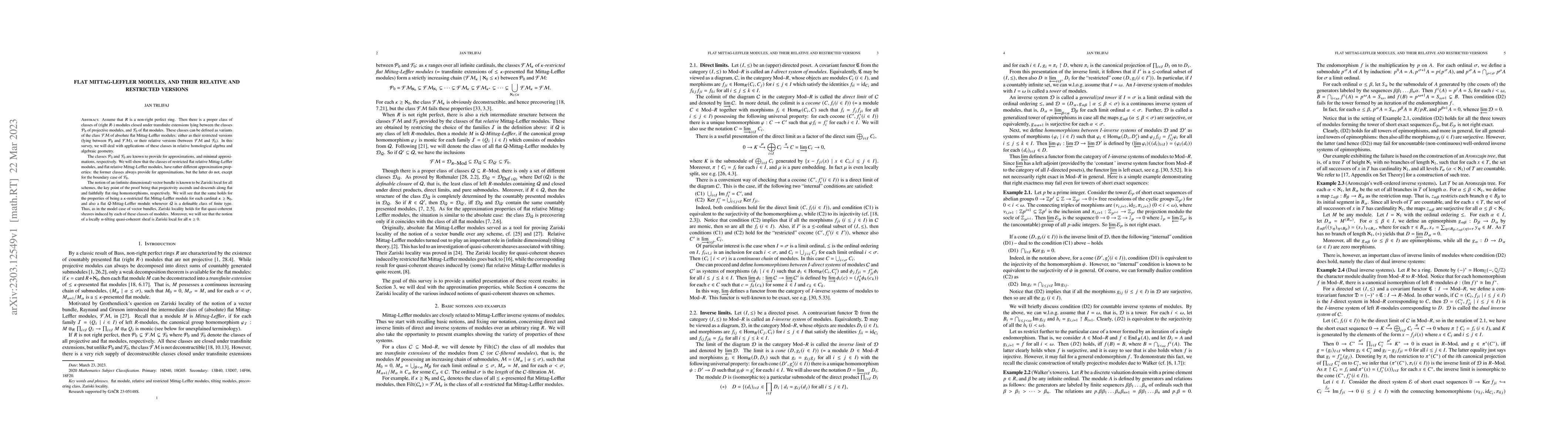 Assume that $R$ is a non-right perfect ring. Then there is a proper class of classes of (right $R$-) modules closed under transfinite extensions lying between the classes $\mathcal P _0$ of projective modules, and $\mathcal F _0$ of flat modules. These classes can be defined as variants of the class $\mathcal F \mathcal M$ of absolute flat Mittag-Leffler modules: either as their restricted versions (lying between $\mathcal P _0$ and $\mathcal F \mathcal M$), or their relative versions (between $\mathcal F \mathcal M$ and $\mathcal F _0$). In this survey, we will deal with applications of these classes in relative homological algebra and algebraic geometry. The classes $\mathcal P _0$ and $\mathcal F _0$ are known to provide for approximations, and minimal approximations, respectively. We will show that the classes of restricted flat relative Mittag-Leffler modules, and flat relative Mittag-Leffler modules, have rather different approximation properties: the former classes always provide for approximations, but the latter do not, except for the boundary case of $\mathcal F _0$. The notion of an (infinite dimensional) vector bundle is known to be Zariski local for all schemes, the key point of the proof being that projectivity ascends and descends along flat and faithfully flat ring homomorphisms, respectively. We will see that the same holds for the properties of being a $\kappa$-restricted flat Mittag-Leffler module for each cardinal $\kappa \geq \aleph_0$, and also a flat $\mathcal Q$-Mittag-Leffler module whenever $\mathcal Q$ is a definable class of finite type. Thus, as in the model case of vector bundles, Zariski locality holds for flat quasi-coherent sheaves induced by each of these classes of modules. Moreover, we will see that the notion of a locally $n$-tilting quasi-coherent sheaf is Zariski local for all $n \geq 0$.
