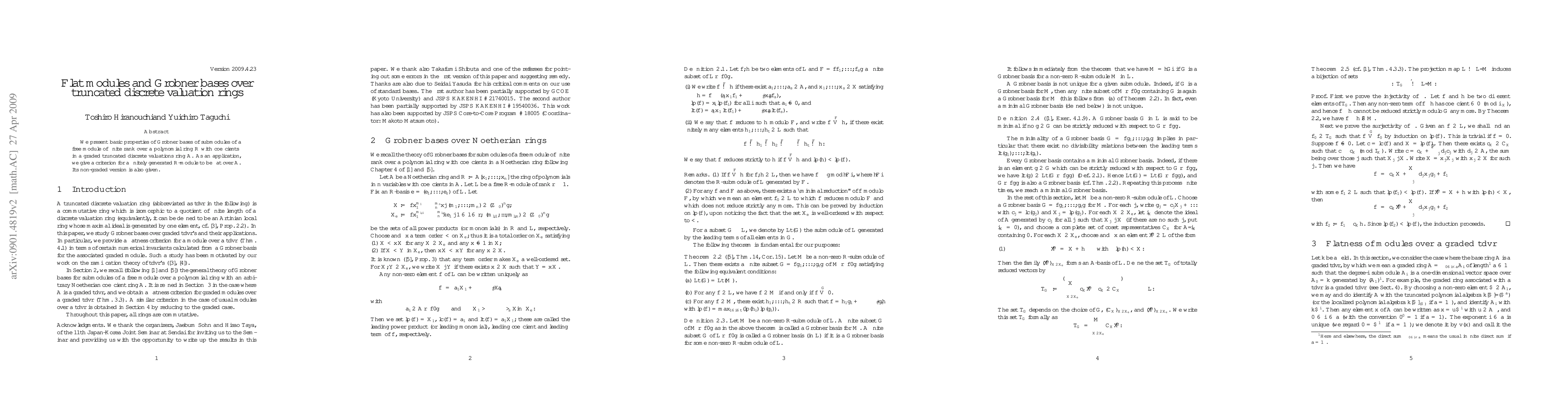 We present basic properties of Gr\"obner bases of submodules of a free module of finite rank over a polynomial ring $R$ with coefficients in a graded truncated discrete valuations ring $A$. As an application, we give a criterion for a finitely generated $R$-module to be flat over $A$. Its non-graded version is also given.