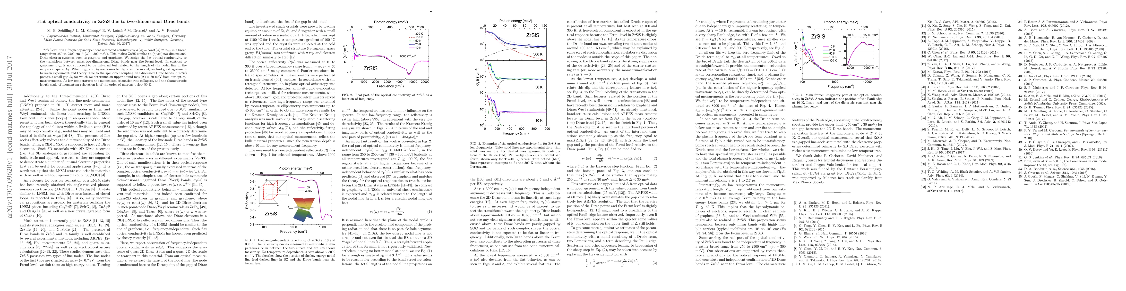 ZrSiS exhibits a frequency-independent interband conductivity $\sigma(\omega) = \rm{const}(\omega) \equiv \sigma_{\rm{flat}}$ in a broad range from 250 to 2500 cm$^{-1}$ (30 - 300 meV). This makes ZrSiS similar to (quasi)two-dimensional Dirac electron systems, such as graphite and graphene. We assign the flat optical conductivity to the transitions between quasi-two-dimensional Dirac bands near the Fermi level. In contrast to graphene, $\sigma_{\rm{flat}}$ is not supposed to be universal but related to the length of the nodal line in the reciprocal space, $k_{0}$. When $\sigma_{\rm{flat}}$ and $k_{0}$ are connected by a simple model, we find good agreement between experiment and theory. Due to the spin-orbit coupling, the discussed Dirac bands in ZrSiS possess a small gap $\Delta$, for which we determine an upper bound max($\Delta$) = 30 meV from our optical measurements. At low temperatures the momentum-relaxation rate collapses, and the characteristic length scale of momentum relaxation is of the order of microns below 50 K.
