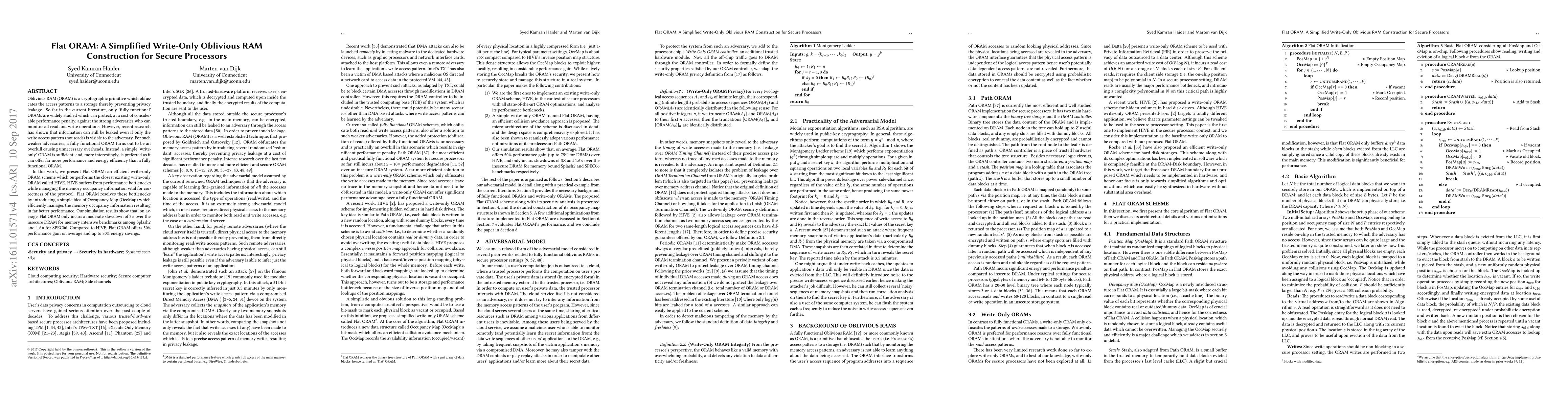 This paper introduces Flat ORAM, an efficient write-only oblivious RAM construction that outperforms the existing HIVE ORAM by using an Occupancy Map to manage memory occupancy information, achieving a moderate slowdown of $3\times$ over insecure DRAM and offering up to $80\%$ energy savings.