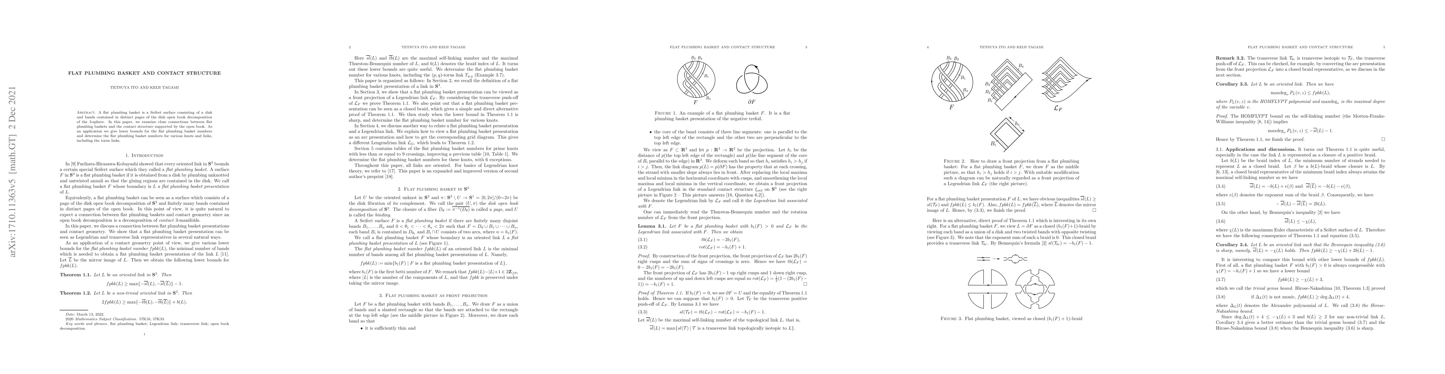 A flat plumbing basket is a Seifert surface consisting of a disk and bands contained in distinct pages of the disk open book decomposition of the 3-sphere. In this paper, we examine close connections between flat plumbing baskets and the contact structure supported by the open book. As an application we give lower bounds for the flat plumbing basket numbers and determine the flat plumbing basket numbers for various knots and links, including the torus links.