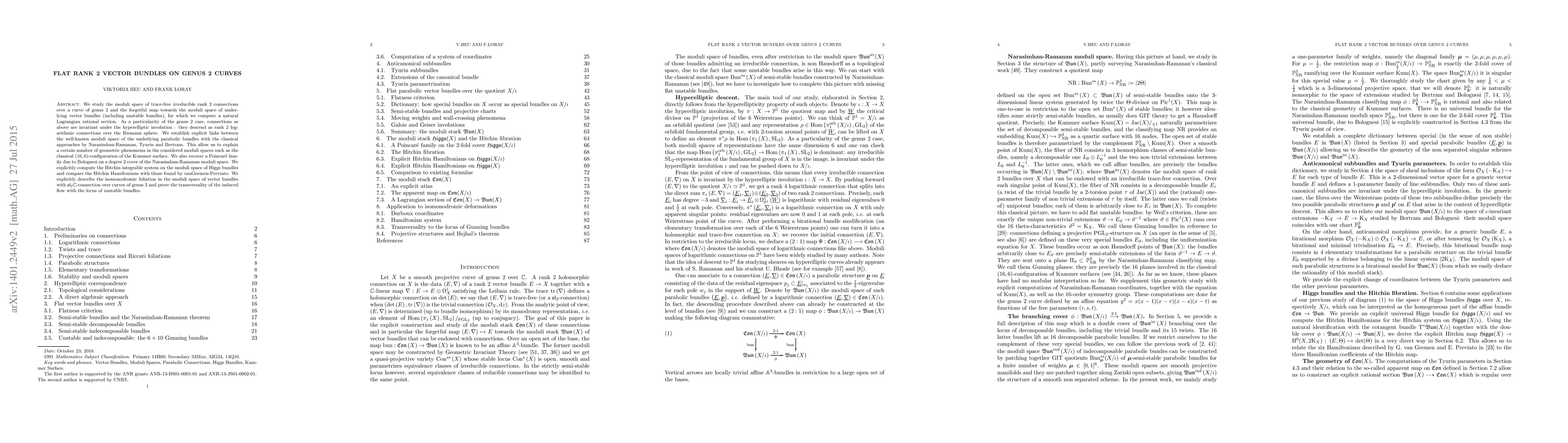We study the moduli space of trace-free irreducible rank 2 holomorphic connections over a complex projective curve of genus 2 and the forgetful map towards the moduli space of underlying vector bundles (including unstable bundles), for which we compute a natural Lagrangian rational section. As a particularity of the genus $2$ case, connections as above are invariant under the hyperelliptic involution : they descend as rank $2$ logarithmic connections over the Riemann sphere. We establish explicit links between the well-known moduli space of the underlying parabolic bundles with the classical approaches by Narasimhan-Ramanan, Tyurin and Bertram. This allow us to explain a certain number of geometric phenomena in the considered moduli spaces such as the classical $(16,6)$-configuration of the Kummer surface. We also recover a Poincar\'e family due to Bolognesi on a degree 2 cover of the Narasimhan-Ramanan moduli space. We explicitly compute the Hitchin integrable system on the moduli space of Higgs bundles and compare the Hitchin Hamiltonians with those found by vanGeemen-Previato. We explicitly describe the isomonodromic foliation in the moduli space of vector bundles with $\mathfrak{sl}_2({\mathbb C})$-connection over curves of genus 2 and prove the transversality of the induced flow with the locus of unstable bundles.