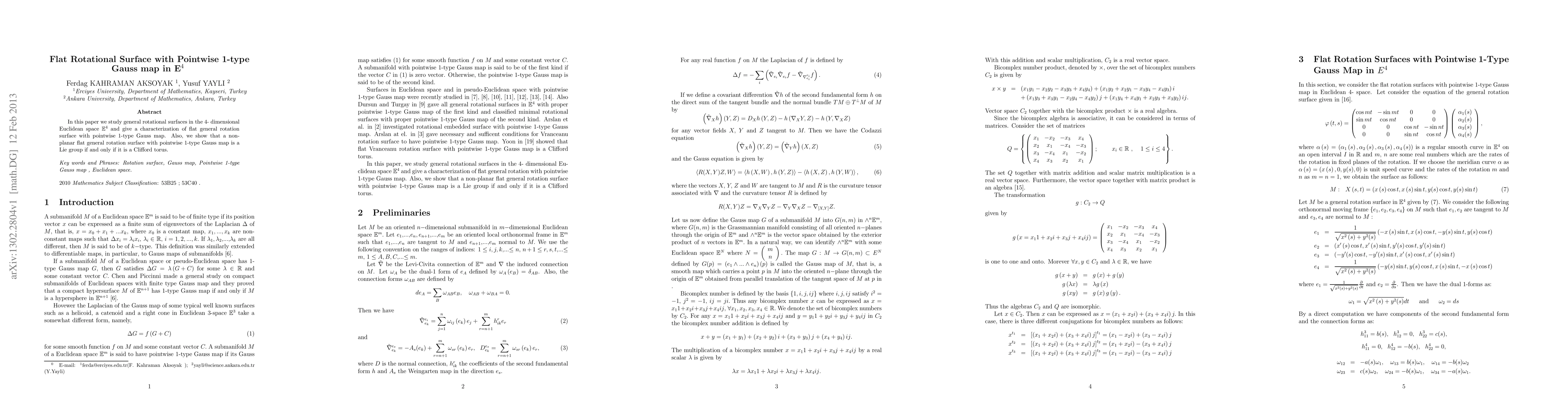 This paper characterizes flat rotational surfaces in E4 with a pointwise 1-type Gauss map and proves that such non-planar surfaces are Lie groups if and only if they are Clifford tori.