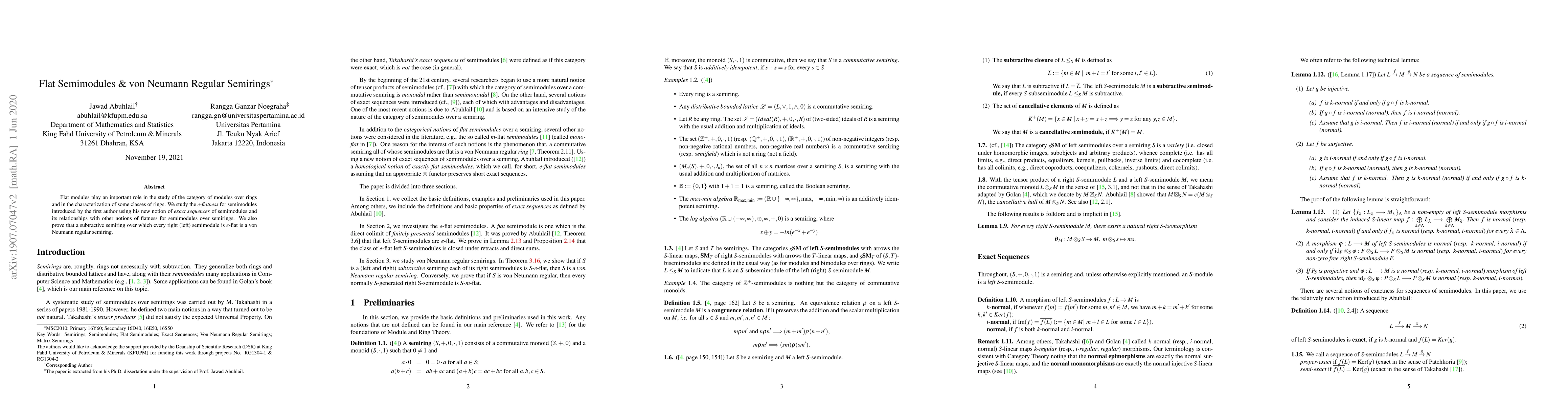 Flat modules play an important role in the study of the category of modules over rings and in the characterization of some classes of rings. We study the e-flatness for semimodules introduced by the first author using his new notion of exact sequences of semimodules and its relationships with other notions of flatness for semimodules over semirings. We also prove that a subtractive semiring over which every right (left) semimodule is e-flat is a von Neumann regular semiring.