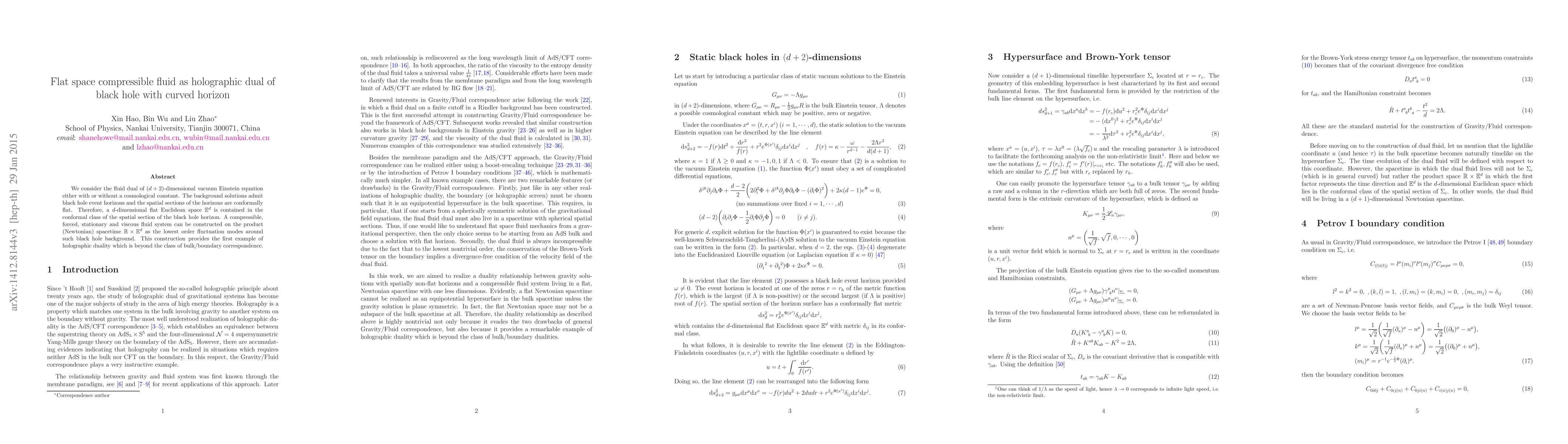 The research constructs a holographic dual of a compressible fluid in flat space to a black hole with a curved horizon, considering small fluctuations around the background solution in a (d+2)-dimensional vacuum Einstein equation with or without a cosmological constant.