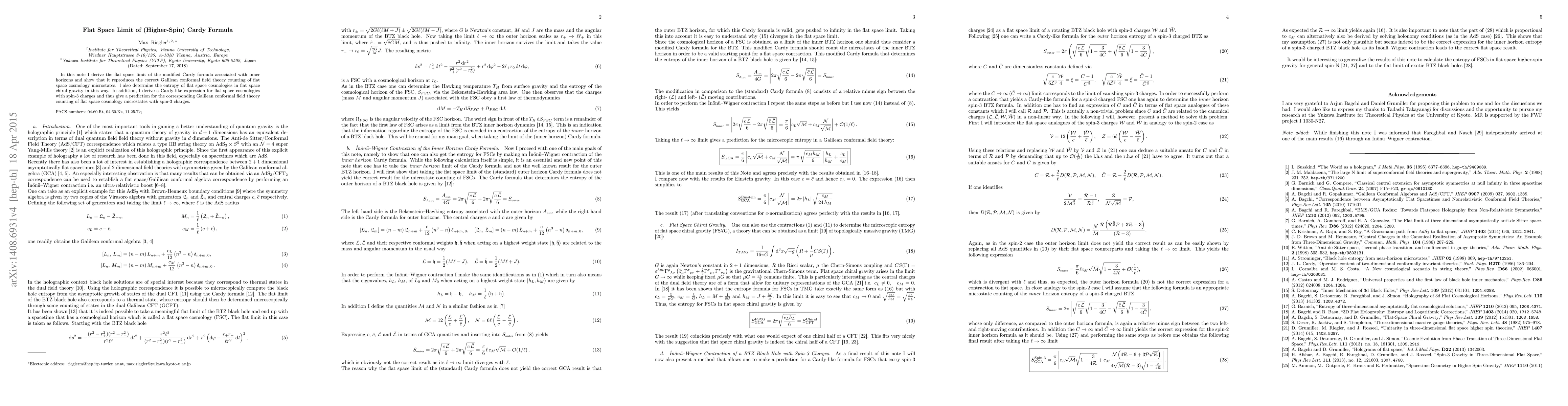 This paper derives the flat space limit of the modified Cardy formula for inner horizons, showing it aligns with the Galilean conformal field theory for flat space cosmology microstates. It also predicts the entropy of flat space cosmologies in flat space chiral gravity and extends the Cardy-like expression to include spin-3 charges.