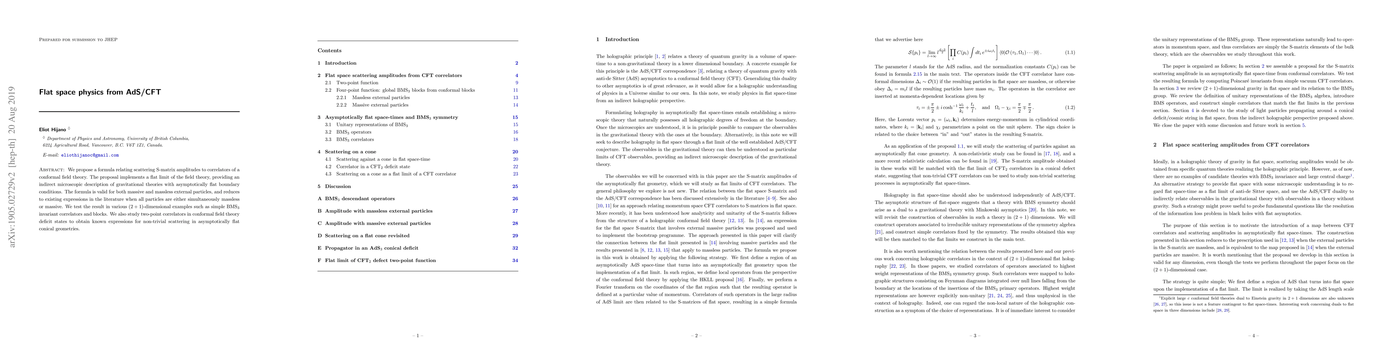 We propose a formula relating scattering S-matrix amplitudes to correlators of a conformal field theory. The proposal implements a flat limit of the field theory, providing an indirect microscopic description of gravitational theories with asymptotically flat boundary conditions. The formula is valid for both massive and massless external particles, and reduces to existing expressions in the literature when all particles are either simultaneously massless or massive. We test the result in various (2+1)-dimensional examples such as simple BMS3 invariant correlators and blocks. We also study two-point correlators in conformal field theory deficit states to obtain known expressions for non-trivial scattering in asymptotically flat conical geometries.