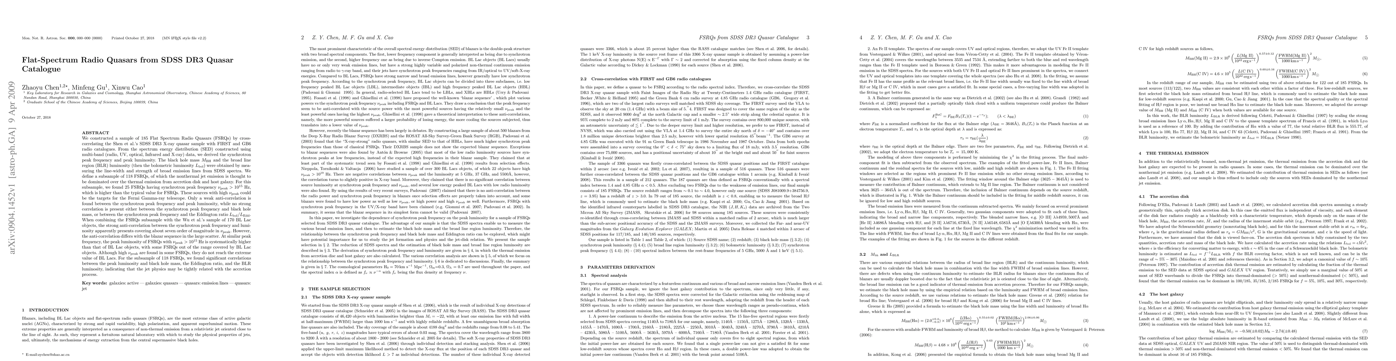 This paper identifies and analyzes 185 Flat Spectrum Radio Quasars (FSRQs) from the SDSS DR3 catalogue, finding 25 with unusually high synchrotron peak frequencies. It reveals significant correlations between peak luminosity and black hole mass, Eddington ratio, and BLR luminosity, suggesting a strong link between jet physics and accretion processes.