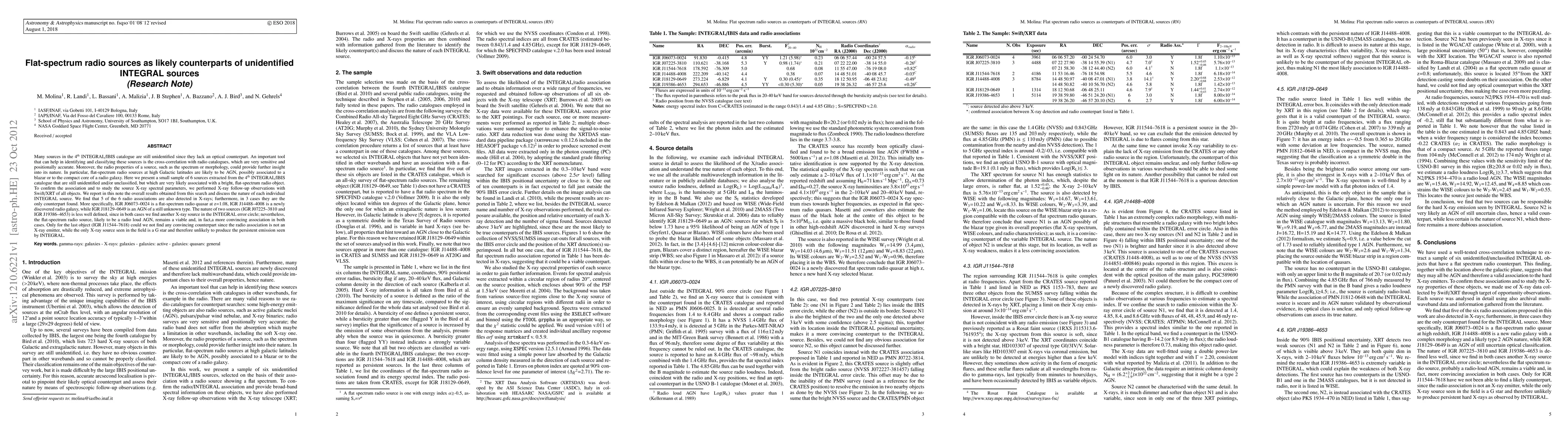Many sources in the fourth INTEGRAL/IBIS catalogue are still unidentified, since they lack an optical counterpart. An important tool that can help in identifying/classifying these sources is the cross-correlation with radio catalogues, which are very sensitive and positionally accurate. Moreover, the radio properties of a source, such as the spectrum or morphology, could provide further insight into its nature. Flat-spectrum radio sources at high Galactic latitudes are likely to be AGN, possibly associated to a blazar or to the compact core of a radio galaxy. Here we present a small sample of 6 sources extracted from the fourth INTEGRAL/IBIS catalogue that are still unidentified/unclassified, but which are very likely associated with a bright, flat-spectrum radio object. To confirm the association and to study the source X-ray spectral parameters, we performed X-ray follow-up observations with Swift/XRT. We report the results obtained from this search and discuss the nature of each source. 5 of the 6 radio associations are also detected in X-rays; in 3 cases they are the only counterpart found. IGR J06073--0024 is a flat-spectrum radio quasar at z=1.08, IGR J14488--4008 is a newly discovered radio galaxy, while IGR J18129--0649 is an AGN of a still unknown type. The nature of IGR J07225--3810 and IGR J19386--4653 is less well defined, since in both cases we find another X-ray source in the INTEGRAL error circle; nevertheless, the flat-spectrum radio source, likely to be a radio loud AGN, remains a viable and more convincing association in both cases. Only for IGR J11544--7618 could we not find any convincing counterpart since the radio association is not an X-ray emitter.