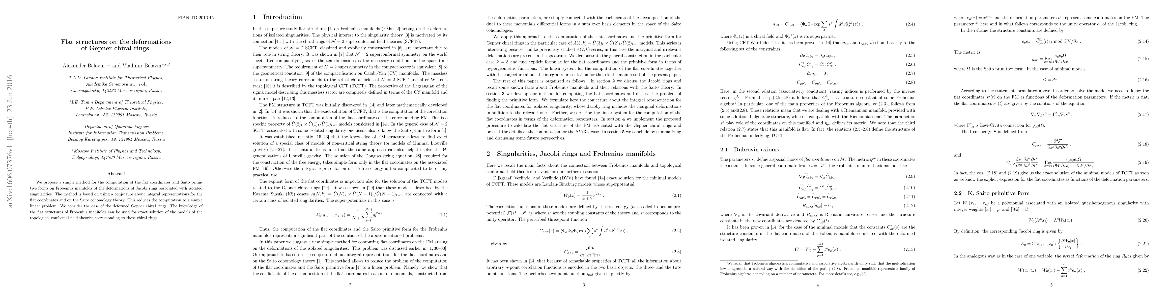 We propose a simple method for the computation of the flat coordinates and Saito primitive forms on Frobenius manifolds of the deformations of Jacobi rings associated with isolated singularities. The method is based on using a conjecture about integral representations for the flat coordinates and on the Saito cohomology theory. This reduces the computation to a simple linear problem. We consider the case of the deformed Gepner chiral rings. The knowledge of the flat structures of Frobenius manifolds can be used for exact solution of the models of the topological conformal field theories corresponding to these chiral rings.