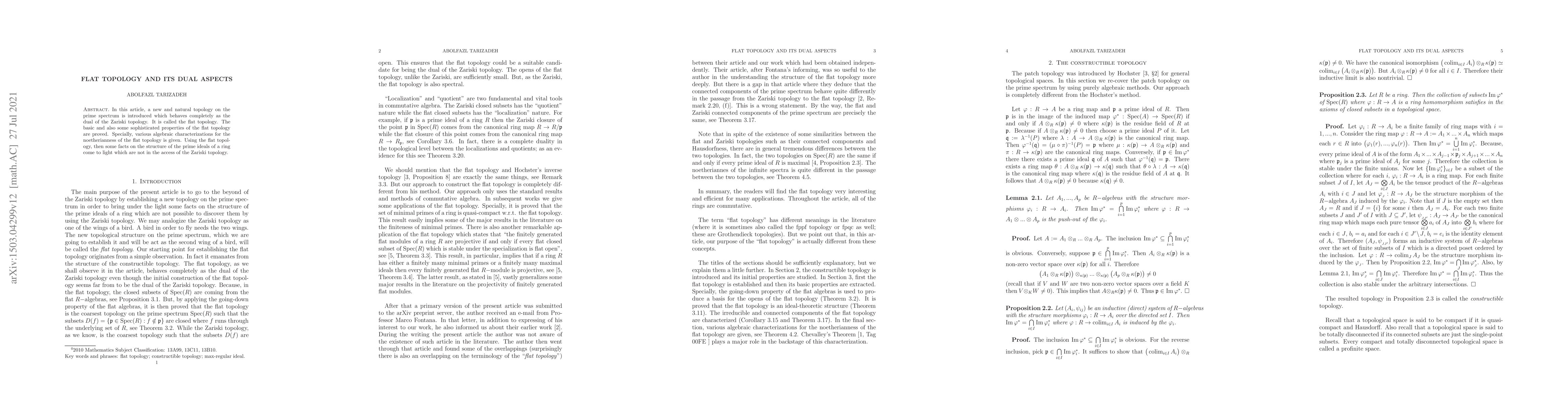 In this article, a new and natural topology on the prime spectrum is established which behaves completely as the dual of the Zariski topology. It is called the flat topology. The basic and also some sophisticated properties of the flat topology are proved. Specially, various algebraic characterizations for the noetherianness of the flat topology are given. Using the flat topology, then some facts on the structure of the prime ideals of a ring come to light which are not in the access of the Zariski topology.