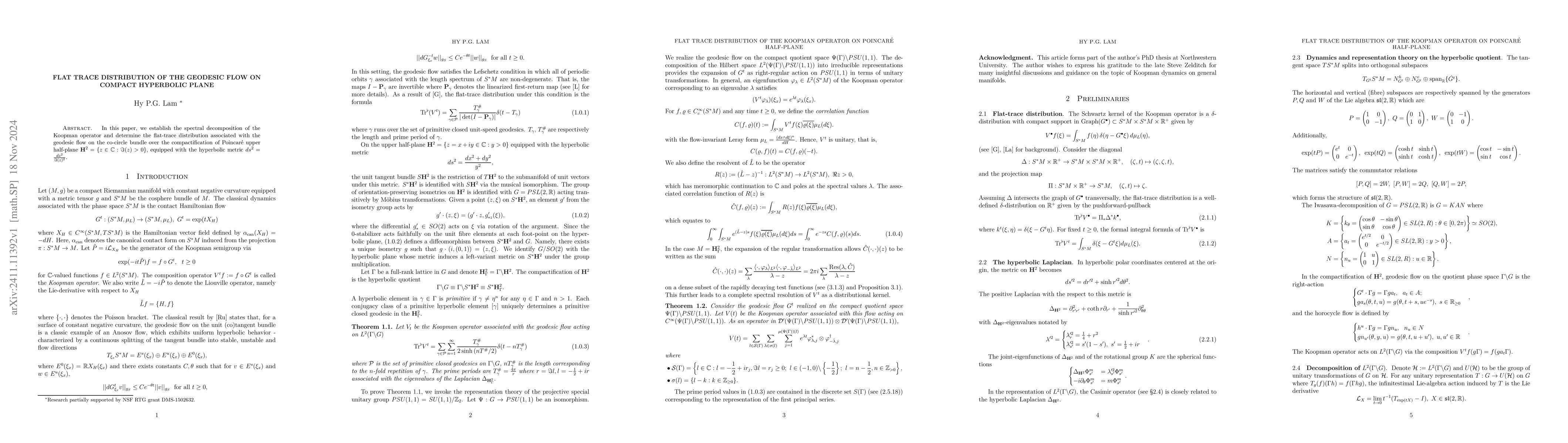 Summary: The study reveals the spectral decomposition of the Koopman operator and identifies the flat-trace distribution related to the geodesic flow on the compactified hyperbolic plane, focusing on the co-circle bundle over Poincaré upper half-plane.