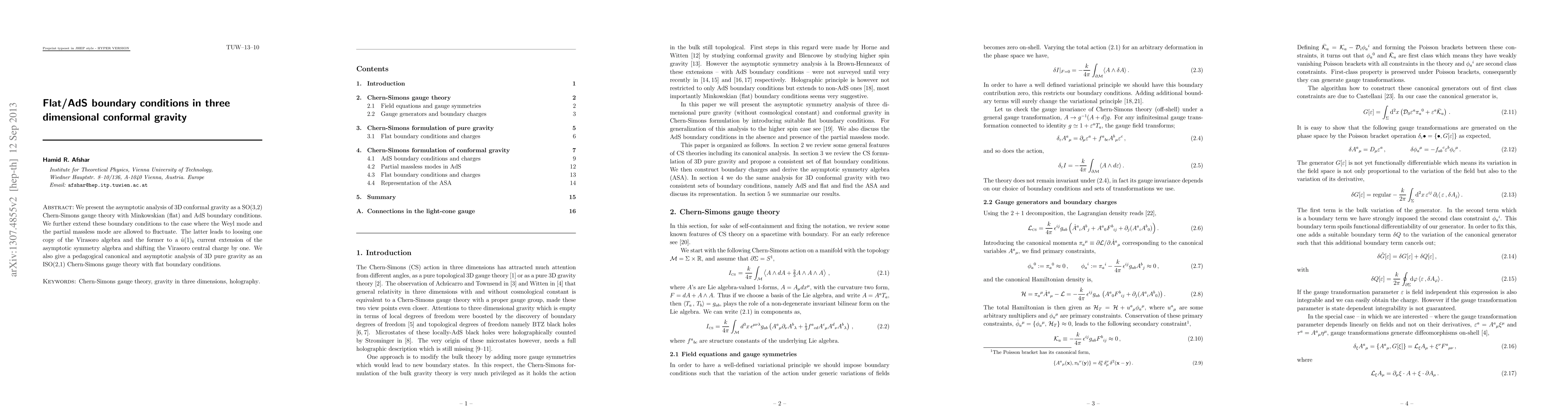 We present the asymptotic analysis of 3D conformal gravity as a SO(3,2) Chern-Simons gauge theory with Minkowskian (flat) and AdS boundary conditions. We further extend these boundary conditions to the case where the Weyl mode and the partial massless mode are allowed to fluctuate. The latter leads to loosing one copy of the Virasoro algebra and the former to a u(1) current extension of the asymptotic symmetry algebra and shifting the Virasoro central charge by one. We also give a pedagogical canonical and asymptotic analysis of 3D pure gravity as an ISO(2,1) Chern-Simons gauge theory with flat boundary conditions.