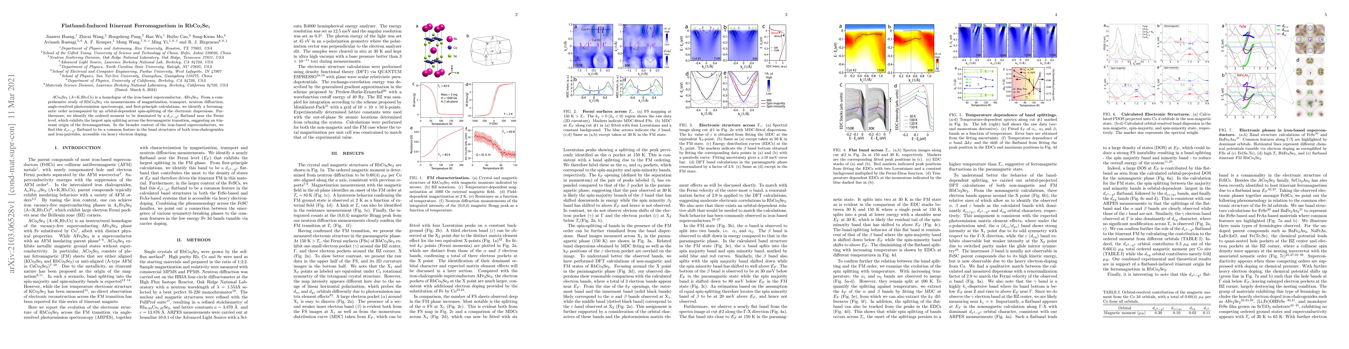 The paper investigates RbCo$_2$Se$_2$ and discovers a ferromagnetic order with orbital-dependent spin-splitting of electronic dispersions. The ferromagnetism originates from a $d_{x^2-y^2}$ flatband near the Fermi level, a feature also present in iron-based superconductors via heavy electron doping.