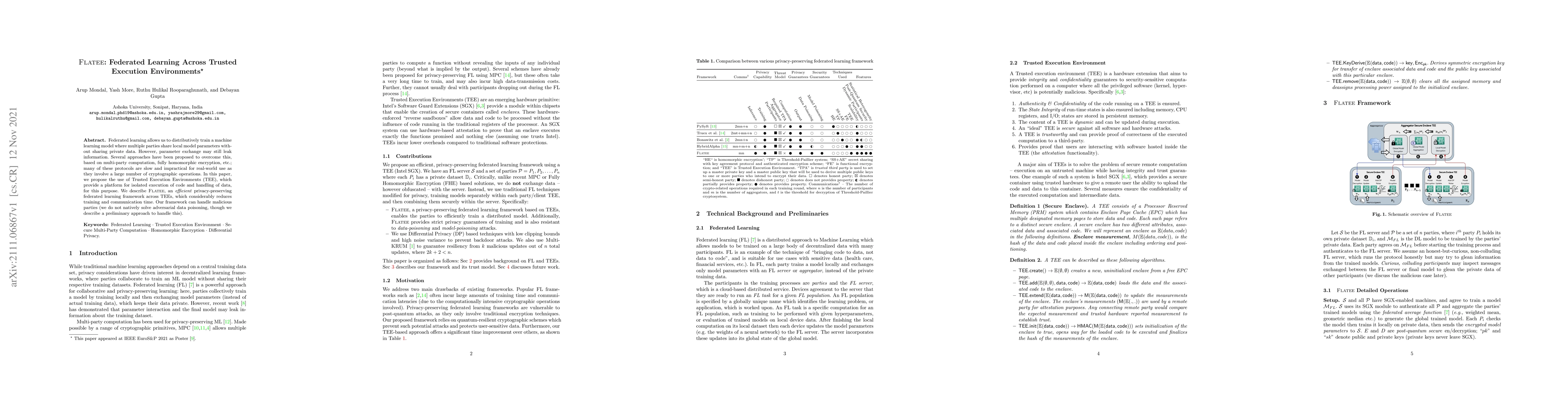 Flatee proposes a federated learning framework leveraging Trusted Execution Environments (TEEs) to enhance privacy and efficiency by reducing training and communication time, while addressing some challenges in handling malicious parties. The framework aims to mitigate information leakage during parameter exchange in federated learning.