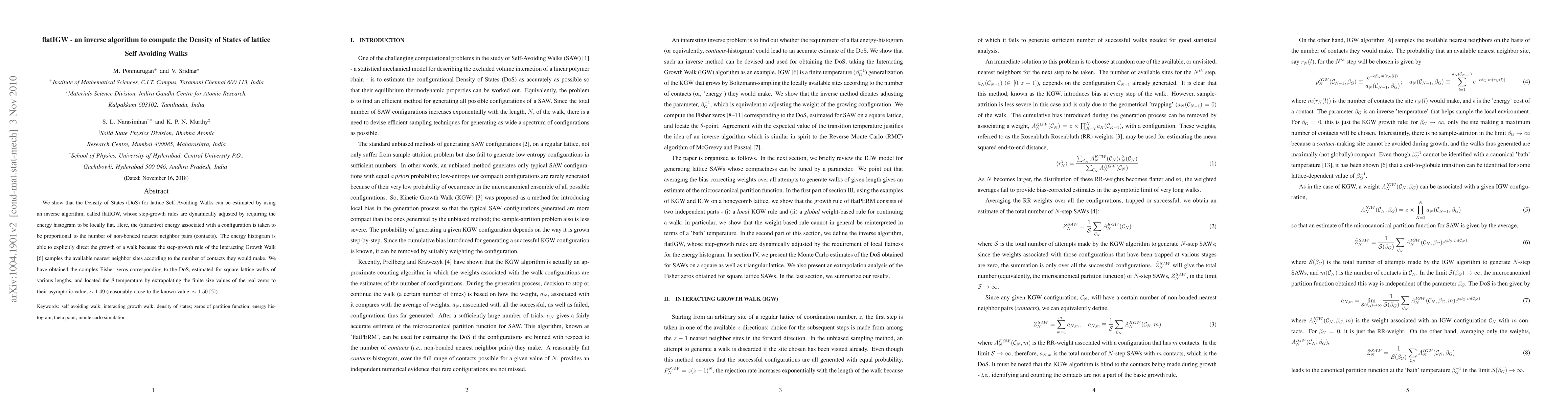 We show that the Density of States (DoS) for lattice Self Avoiding Walks can be estimated by using an inverse algorithm, called flatIGW, whose step-growth rules are dynamically adjusted by requiring the energy histogram to be locally flat. Here, the (attractive) energy associated with a configuration is taken to be proportional to the number of non-bonded nearest neighbor pairs (contacts). The energy histogram is able to explicitly direct the growth of a walk because the step-growth rule of the Interacting Growth Walk \cite{IGW} samples the available nearest neighbor sites according to the number of contacts they would make. We have obtained the complex Fisher zeros corresponding to the DoS, estimated for square lattice walks of various lengths, and located the $\theta$ temperature by extrapolating the finite size values of the real zeros to their asymptotic value, $\sim 1.49$ (reasonably close to the known value, $\sim 1.50$ \cite{barkema}).