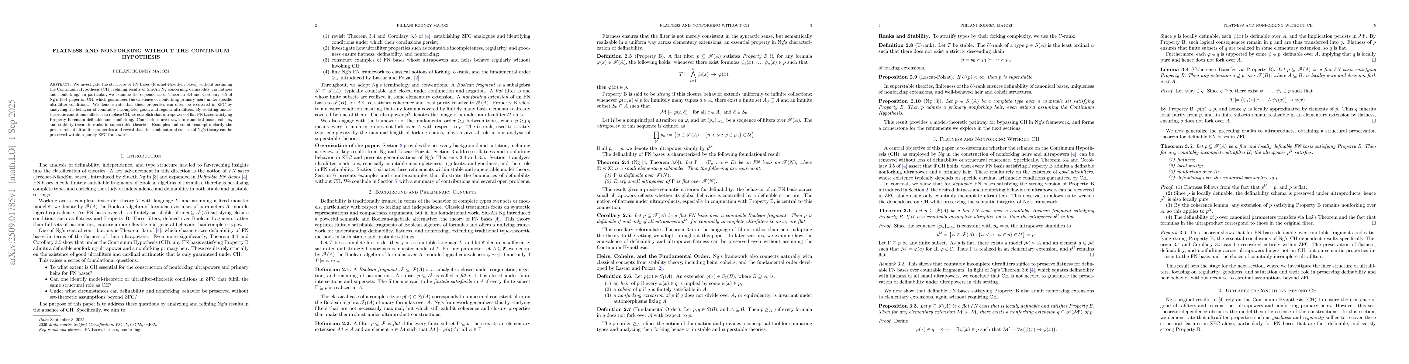 We investigate the structure of FN bases (Frechet-Nikodym bases) without assuming the Continuum Hypothesis (CH), refining results of Siu-Ah Ng concerning definability via flatness and nonforking. In particular, we examine the dependence of Theorem 3.4 and Corollary 3.5 of Ng's 1991 paper on CH, which guarantees the existence of nonforking primary heirs under specific ultrafilter conditions. We demonstrate that these properties can often be recovered in ZFC by analyzing the behavior of countably incomplete, good, and regular ultrafilters. By isolating model-theoretic conditions sufficient to replace CH, we establish that ultrapowers of flat FN bases satisfying Property B remain definable and nonforking. Connections are drawn to canonical bases, coheirs, and stability-theoretic ranks in superstable theories. Examples and counterexamples clarify the precise role of ultrafilter properties and reveal that the combinatorial essence of Ng's theory can be preserved within a purely ZFC framework.