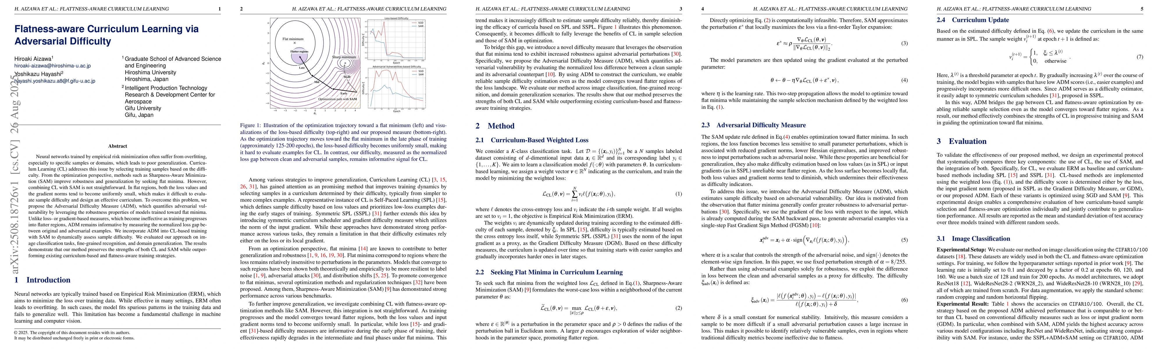 Neural networks trained by empirical risk minimization often suffer from overfitting, especially to specific samples or domains, which leads to poor generalization. Curriculum Learning (CL) addresses this issue by selecting training samples based on the difficulty. From the optimization perspective, methods such as Sharpness-Aware Minimization (SAM) improve robustness and generalization by seeking flat minima. However, combining CL with SAM is not straightforward. In flat regions, both the loss values and the gradient norms tend to become uniformly small, which makes it difficult to evaluate sample difficulty and design an effective curriculum. To overcome this problem, we propose the Adversarial Difficulty Measure (ADM), which quantifies adversarial vulnerability by leveraging the robustness properties of models trained toward flat minima. Unlike loss- or gradient-based measures, which become ineffective as training progresses into flatter regions, ADM remains informative by measuring the normalized loss gap between original and adversarial examples. We incorporate ADM into CL-based training with SAM to dynamically assess sample difficulty. We evaluated our approach on image classification tasks, fine-grained recognition, and domain generalization. The results demonstrate that our method preserves the strengths of both CL and SAM while outperforming existing curriculum-based and flatness-aware training strategies.