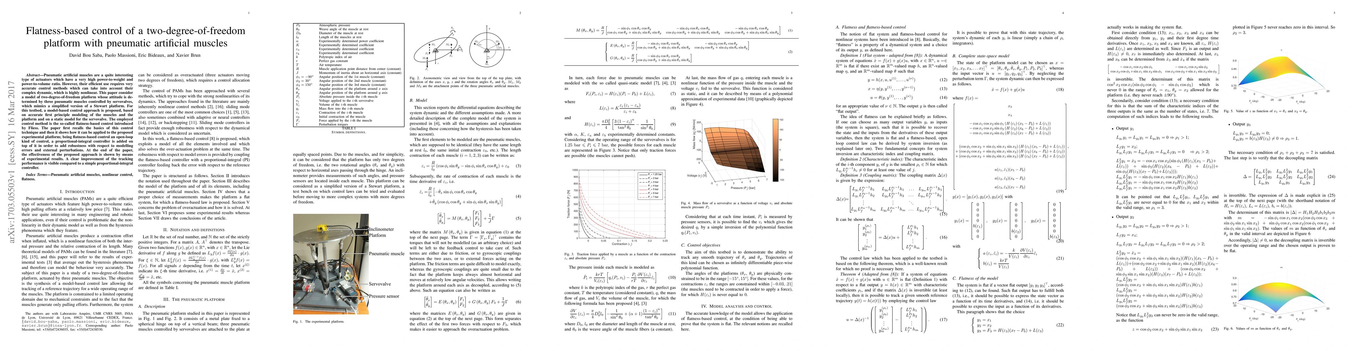 This paper proposes a flatness-based control method for a two-degree-of-freedom platform actuated by pneumatic artificial muscles, demonstrating improved tracking performance over a simple proportional-integral controller, with robustness added to model inaccuracies and external disturbances.