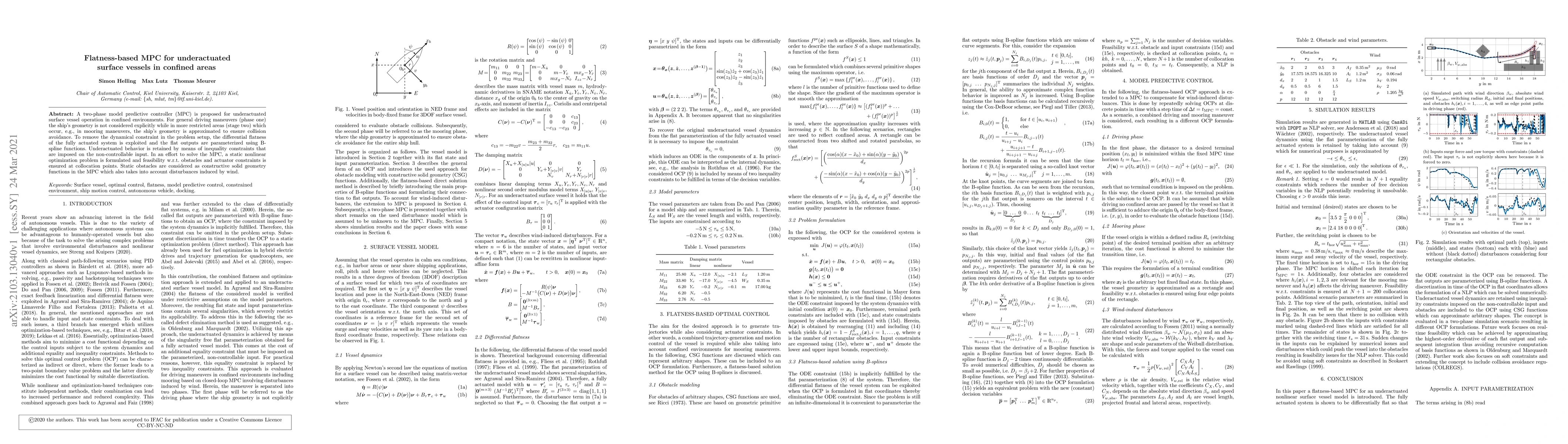 This paper proposes a two-phase MPC for underactuated surface vessels navigating confined areas, utilizing differential flatness and B-spline parameterization for control. It ensures obstacle avoidance and accounts for disturbances, solving a static nonlinear optimization problem to maintain feasibility.
