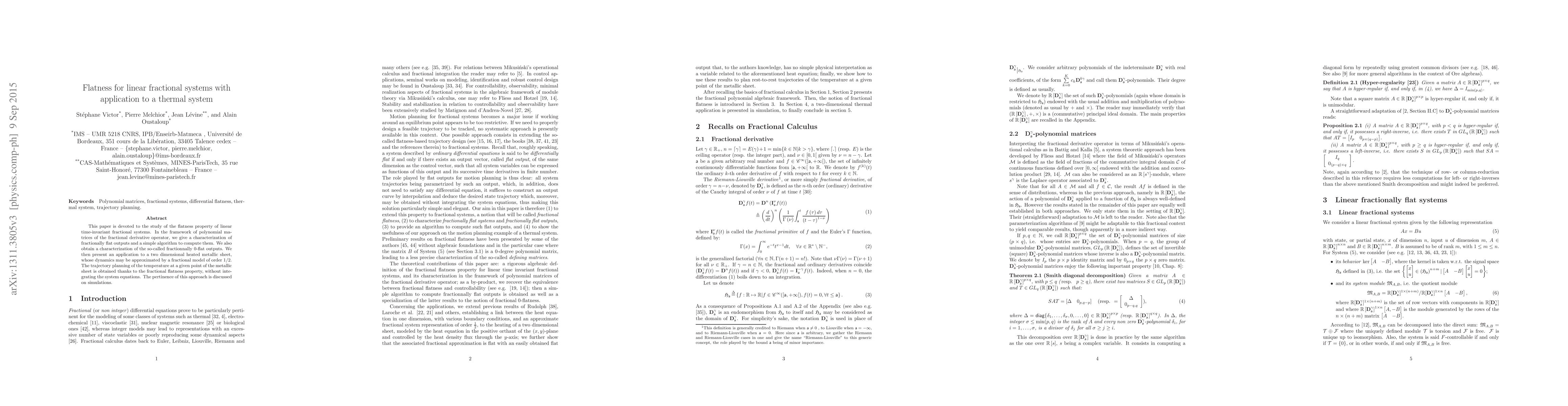 This paper is devoted to the study of the flatness property of linear time-invariant fractional systems. In the framework of polynomial matrices of the fractional derivative operator, we give a characterization of fractionally flat outputs and a simple algorithm to compute them. We also obtain a characterization of the so-called fractionnally $0$-flat outputs. We then present an application to a two dimensional heated metallic sheet, whose dynamics may be approximated by a fractional model of order 1/2. The trajectory planning of the temperature at a given point of the metallic sheet is obtained thanks to the fractional flatness property, without integrating the system equations. The pertinence of this approach is discussed on simulations.