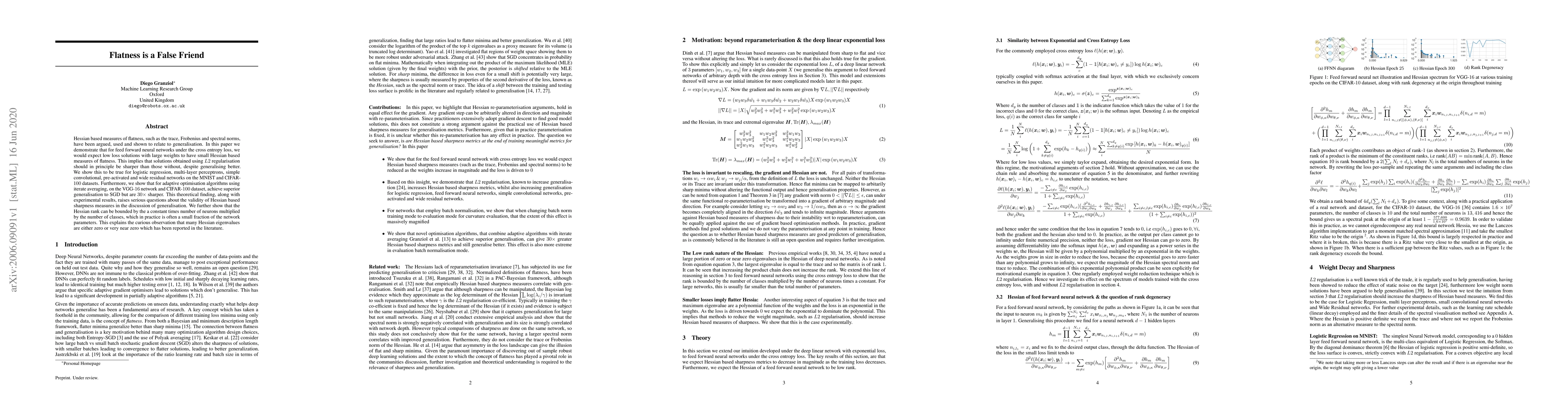 Hessian based measures of flatness, such as the trace, Frobenius and spectral norms, have been argued, used and shown to relate to generalisation. In this paper we demonstrate that for feed forward neural networks under the cross entropy loss, we would expect low loss solutions with large weights to have small Hessian based measures of flatness. This implies that solutions obtained using $L2$ regularisation should in principle be sharper than those without, despite generalising better. We show this to be true for logistic regression, multi-layer perceptrons, simple convolutional, pre-activated and wide residual networks on the MNIST and CIFAR-$100$ datasets. Furthermore, we show that for adaptive optimisation algorithms using iterate averaging, on the VGG-$16$ network and CIFAR-$100$ dataset, achieve superior generalisation to SGD but are $30 \times$ sharper. This theoretical finding, along with experimental results, raises serious questions about the validity of Hessian based sharpness measures in the discussion of generalisation. We further show that the Hessian rank can be bounded by the a constant times number of neurons multiplied by the number of classes, which in practice is often a small fraction of the network parameters. This explains the curious observation that many Hessian eigenvalues are either zero or very near zero which has been reported in the literature.