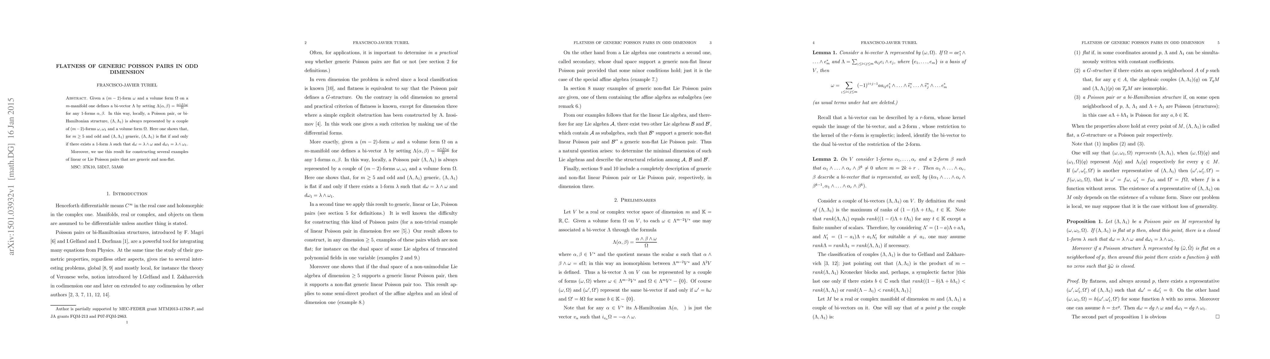 Given a $(m-2)$-form $\zw$ and a volume form $\zW$ on a $m$-manifold one defines a bi-vector $\zL$ by setting $\zL(\za,\zb)={\frac {\za\zex\zb\zex\zw} {\zW}}$ for any $1$-forms $\za,\zb$. In this way, locally, a Poisson pair, or bi-Hamiltonian structure, $(\zL,\zL_1 )$ is always represented by a couple of $(m-2)$-forms $\zw,\zw_1$ and a volume form $\zW$. Here one shows that, for $m\zmai 5$ and odd and $(\zL,\zL_1 )$ generic, $(\zL,\zL_1 )$ is flat if and only if there exists a $1$-form $\zl$ such that $d\zw=\zl\zex\zw$ and $d\zw_1 =\zl\zex\zw_1$.