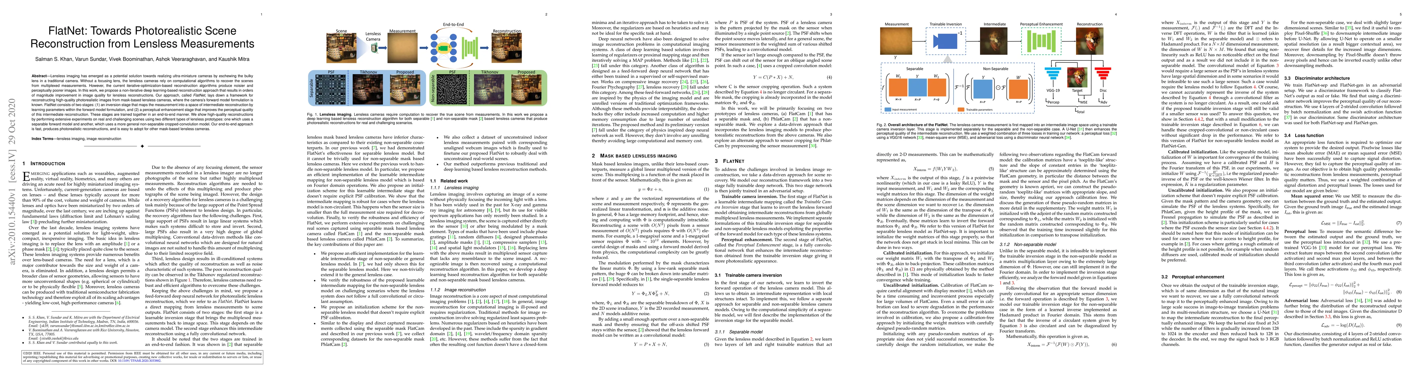 FlatNet proposes a non-iterative deep learning method for reconstructing high-quality, photorealistic images from lensless camera measurements, significantly improving image quality over existing iterative algorithms. The approach consists of an inversion stage and a perceptual enhancement stage, trained end-to-end to produce fast, realistic reconstructions suitable for various lensless camera models.
