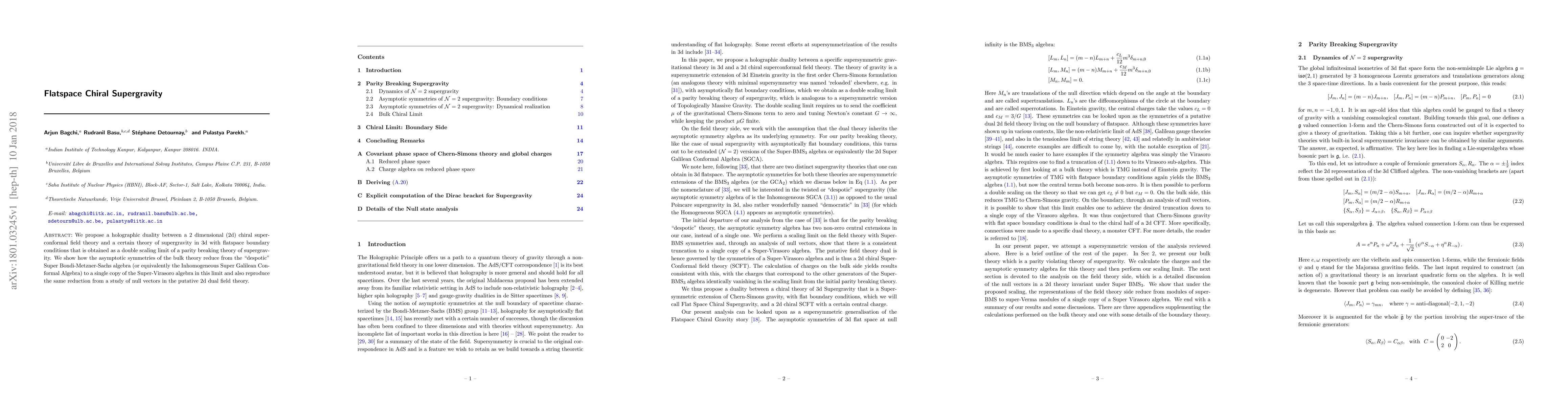 We propose a holographic duality between a 2 dimensional (2d) chiral superconformal field theory and a certain theory of supergravity in 3d with flatspace boundary conditions that is obtained as a double scaling limit of a parity breaking theory of supergravity. We show how the asymptotic symmetries of the bulk theory reduce from the "despotic" Super Bondi-Metzner-Sachs algebra (or equivalently the Inhomogeneous Super Galilean Conformal Algebra) to a single copy of the Super-Virasoro algebra in this limit and also reproduce the same reduction from a study of null vectors in the putative 2d dual field theory.
