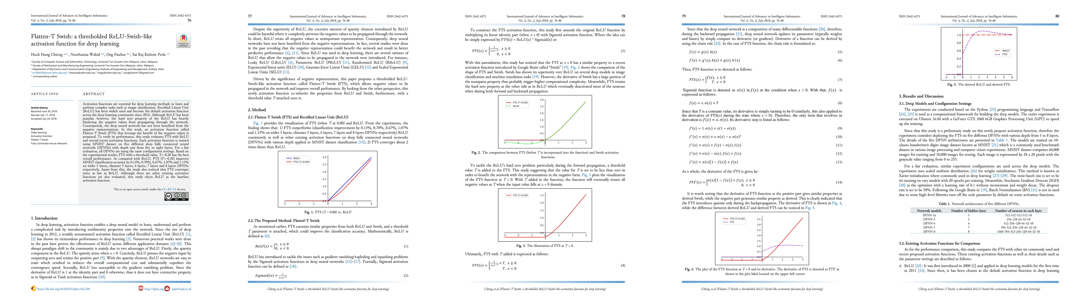 The paper proposes Flatten-T Swish (FTS), a new activation function that aims to leverage negative values in deep learning, addressing the limitations of ReLU. Experimental results on MNIST using various deep fully connected neural networks show that FTS with a threshold T=-0.20 outperforms ReLU in classification accuracy and converges faster.