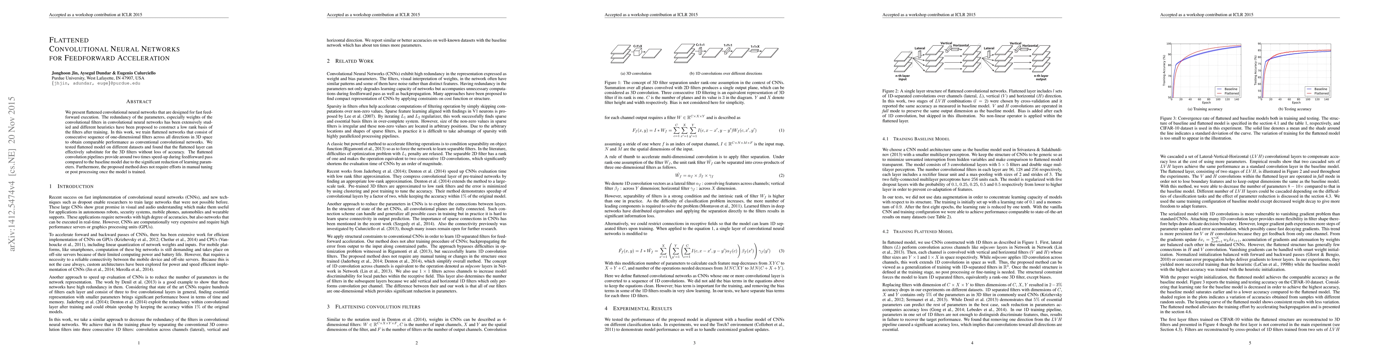This paper introduces flattened convolutional neural networks designed for accelerated feedforward execution by reducing parameter redundancy. The flattened model, using one-dimensional filters, achieves comparable performance to conventional 3D convolutional networks with a notable two-fold speed-up, without requiring manual tuning or post-processing.