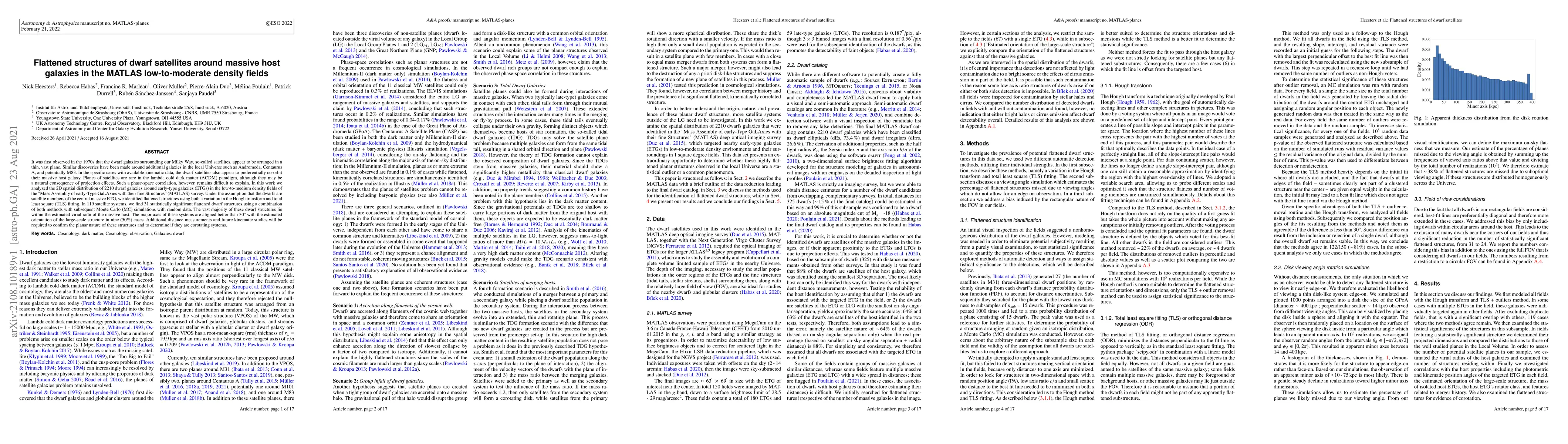 This study analyzes the spatial distribution of 2210 dwarf galaxies around early-type galaxies in the MATLAS survey, identifying 31 statistically significant flattened structures using Hough transform and TLS fitting. Most of these structures lie within the host galaxies' virial radii and align with the large-scale structure orientation, suggesting potential co-orbiting behavior. Further studies are needed to confirm their planar nature and corotation.
