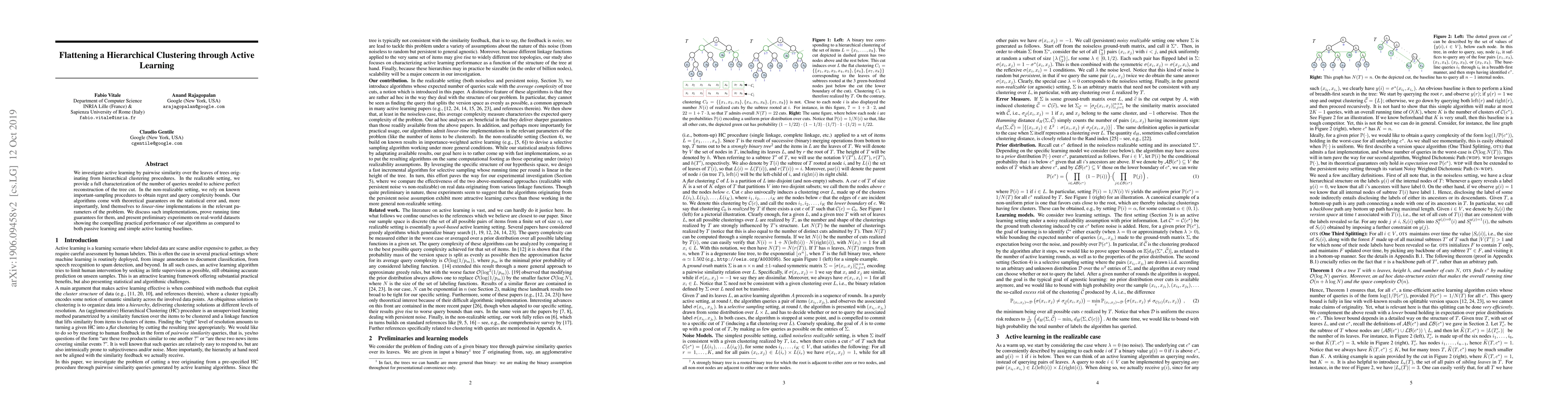 We investigate active learning by pairwise similarity over the leaves of trees originating from hierarchical clustering procedures. In the realizable setting, we provide a full characterization of the number of queries needed to achieve perfect reconstruction of the tree cut. In the non-realizable setting, we rely on known important-sampling procedures to obtain regret and query complexity bounds. Our algorithms come with theoretical guarantees on the statistical error and, more importantly, lend themselves to linear-time implementations in the relevant parameters of the problem. We discuss such implementations, prove running time guarantees for them, and present preliminary experiments on real-world datasets showing the compelling practical performance of our algorithms as compared to both passive learning and simple active learning baselines.