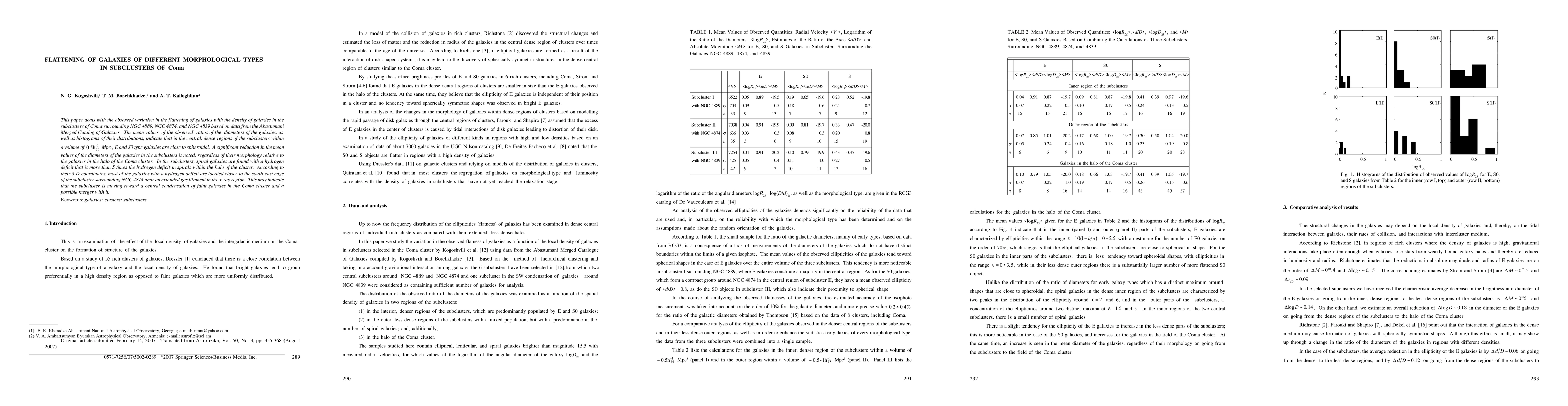 This study examines galaxy flattening in Coma cluster subclusters around NGC4889, NGC4874, and NGC4839. It finds that E and S0 galaxies in dense regions become spheroidal, while spirals show a hydrogen deficit, five times higher than in the Coma cluster halo. Spiral galaxies with hydrogen deficit near NGC4874 suggest a subcluster movement towards Coma's central condensation for potential merger.