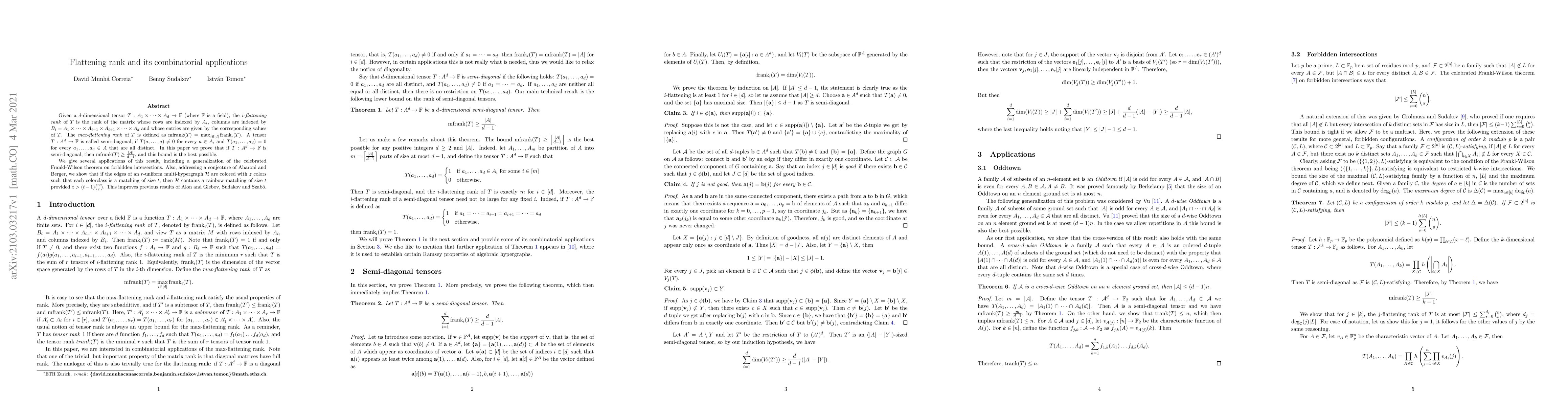 Given a $d$-dimensional tensor $T:A_1\times\dots\times A_d\rightarrow \mathbb{F}$ (where $\mathbb{F}$ is a field), the $i$-flattening rank of $T$ is the rank of the matrix whose rows are indexed by $A_{i}$, columns are indexed by $B_{i}=A_1\times\dots\times A_{i-1}\times A_{i+1}\times\dots\times A_{d}$ and whose entries are given by the corresponding values of $T$. The max-flattening rank of $T$ is defined as $\text{mfrank}(T)=\max_{i\in [d]}\text{frank}_{i}(T)$. A tensor $T:A^{d}\rightarrow\mathbb{F}$ is called semi-diagonal, if $T(a,\dots,a)\neq 0$ for every $a\in A$, and $T(a_{1},\dots,a_{d})=0$ for every $a_{1},\dots,a_{d}\in A$ that are all distinct. In this paper we prove that if $T:A^{d}\rightarrow\mathbb{F}$ is semi-diagonal, then $\text{mfrank}(T)\geq \frac{|A|}{d-1}$, and this bound is the best possible. We give several applications of this result, including a generalization of the celebrated Frankl-Wilson theorem on forbidden intersections. Also, addressing a conjecture of Aharoni and Berger, we show that if the edges of an $r$-uniform multi-hypergraph $\mathcal{H}$ are colored with $z$ colors such that each colorclass is a matching of size $t$, then $\mathcal{H}$ contains a rainbow matching of size $t$ provided $z>(t-1)\binom{rt}{r}$. This improves previous results of Alon and Glebov, Sudakov and Szab\'o.