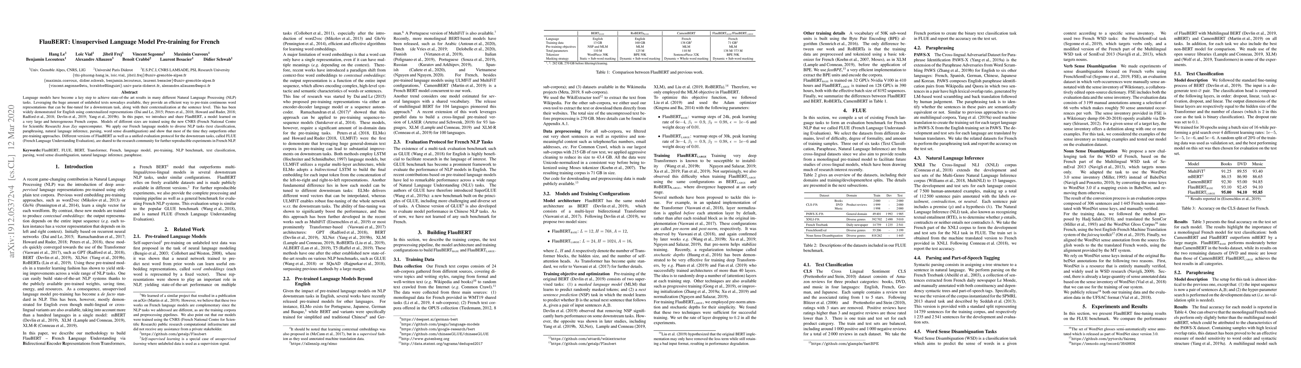 FlauBERT is an unsupervised language model pre-trained for French, developed using a large corpus and demonstrated to outperform other methods on various NLP tasks. The model and evaluation protocol, FLUE, are shared to advance French language research.