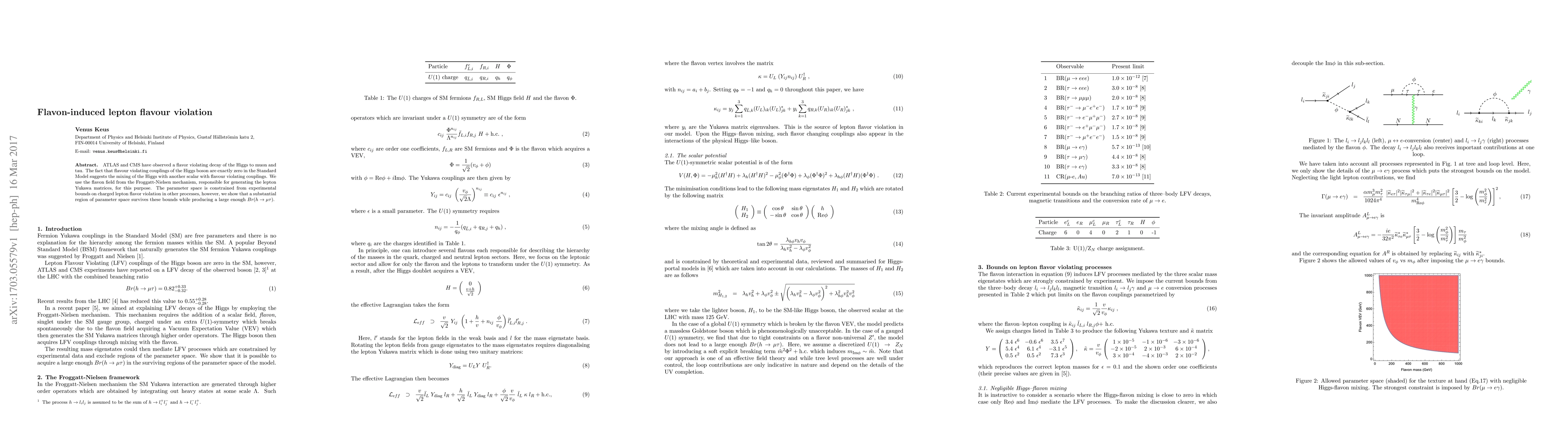 This paper investigates the flavon field mechanism to explain observed Higgs decay to muon and tau leptons, which violates lepton flavor in the Standard Model. Despite experimental constraints, a significant parameter space remains viable for generating the required flavor-violating branching ratio.