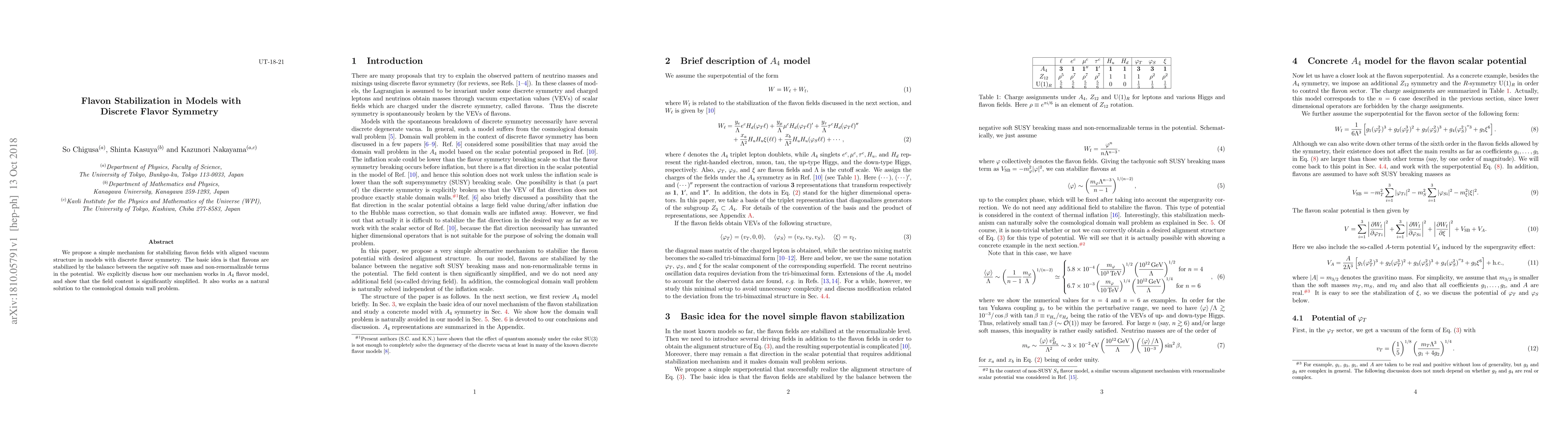 We propose a simple mechanism for stabilizing flavon fields with aligned vacuum structure in models with discrete flavor symmetry. The basic idea is that flavons are stabilized by the balance between the negative soft mass and non-renormalizable terms in the potential. We explicitly discuss how our mechanism works in $A_4$ flavor model, and show that the field content is significantly simplified. It also works as a natural solution to the cosmological domain wall problem.