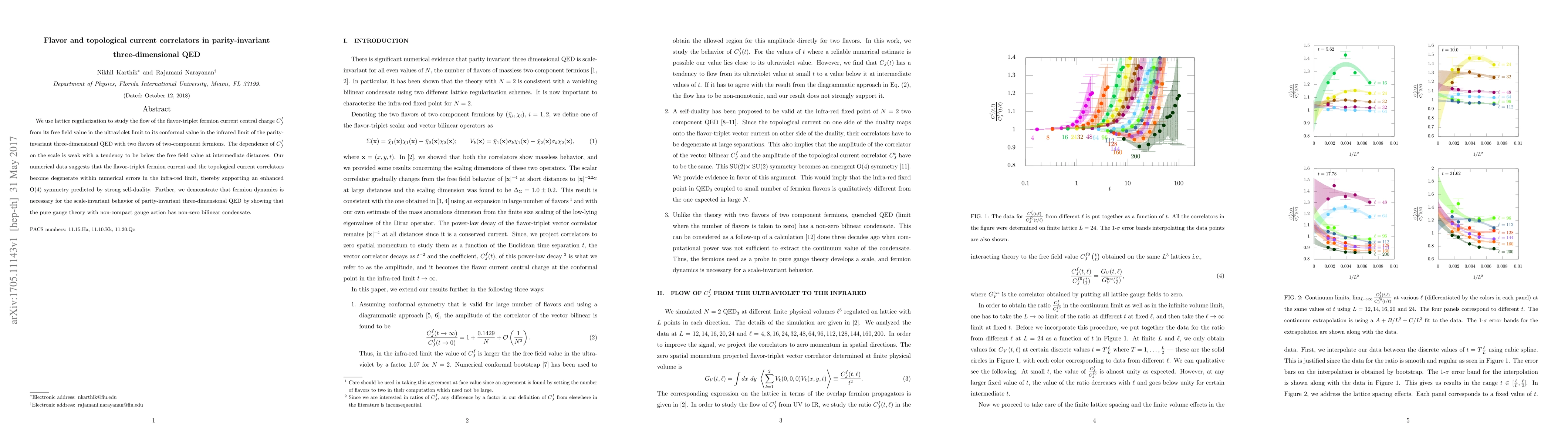 We use lattice regularization to study the flow of the flavor-triplet fermion current central charge $C^f_J$ from its free field value in the ultraviolet limit to its conformal value in the infrared limit of the parity-invariant three-dimensional QED with two flavors of two-component fermions. The dependence of $C^f_J$ on the scale is weak with a tendency to be below the free field value at intermediate distances. Our numerical data suggests that the flavor-triplet fermion current and the topological current correlators become degenerate within numerical errors in the infra-red limit, thereby supporting an enhanced O(4) symmetry predicted by strong self-duality. Further, we demonstrate that fermion dynamics is necessary for the scale-invariant behavior of parity-invariant three-dimensional QED by showing that the pure gauge theory with non-compact gauge action has non-zero bilinear condensate.